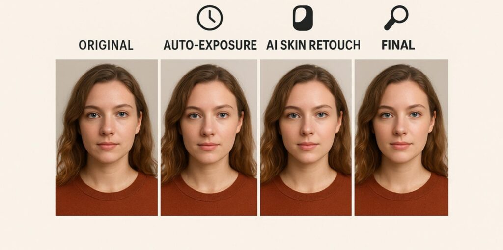 When you upload a photo into an AI tool, it analyzes the entire image and makes intelligent adjustments. For example, it can brighten shadows without affecting highlights, smooth skin while keeping textures natural, or replace backgrounds instantly.