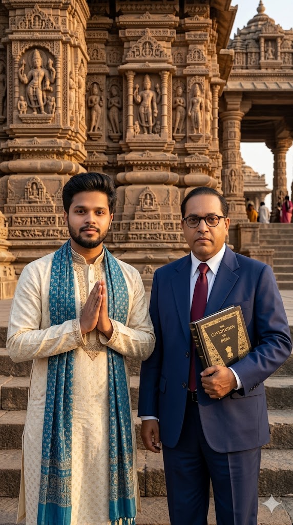 A realistic cultural portrait of a young Indian man standing beside B. R. Ambedkar in front of a grand heritage temple structure, both facing directly toward the camera with composed expressions. The background features intricate stone carvings, steps, and warm sunlight illuminating the architecture. The young man is wearing a traditional cream-colored kurta with a blue stole, standing with hands joined lightly in front, showing respect. Dr. Ambedkar is wearing his signature blue suit and holding the Constitution. The lighting is natural golden hour sunlight, creating soft shadows and a warm glow. Ultra realistic, 8K detail, cinematic composition, rich textures, depth of field, sharp focus on faces, respectful and cultural atmosphere, Take Face From Uploaded image Keep same 100%, aspect ratio 9:16
