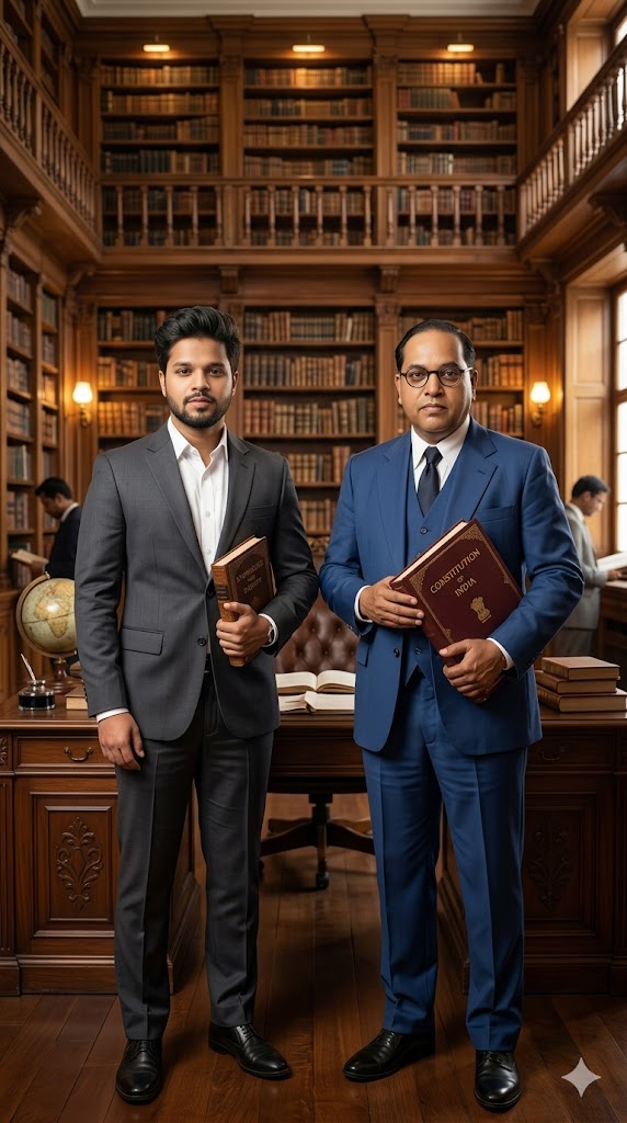 A highly detailed, realistic portrait of a young Indian man standing beside B. R. Ambedkar inside a grand vintage library, both facing directly toward the camera with calm and confident expressions. The background features tall wooden bookshelves filled with books, warm golden lighting, and a large wooden desk symbolizing knowledge and wisdom. The young man is dressed in a formal charcoal grey suit with a white shirt and no tie, holding a book in one hand, representing learning and respect. Dr. Ambedkar is wearing his iconic blue suit with glasses, holding the Constitution. Both are standing upright with a dignified posture. Soft cinematic lighting highlights their faces, creating a scholarly and respectful mood. Ultra-realistic, 8K resolution, depth of field, sharp facial details, warm tones, professional composition, Take Face From Uploaded image Keep same 100%, aspect ratio 9:16