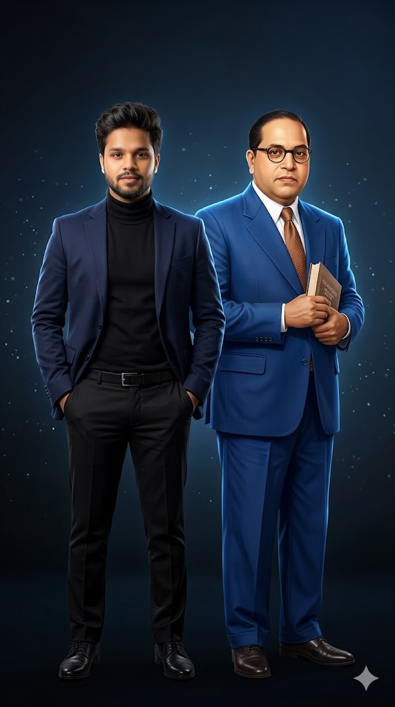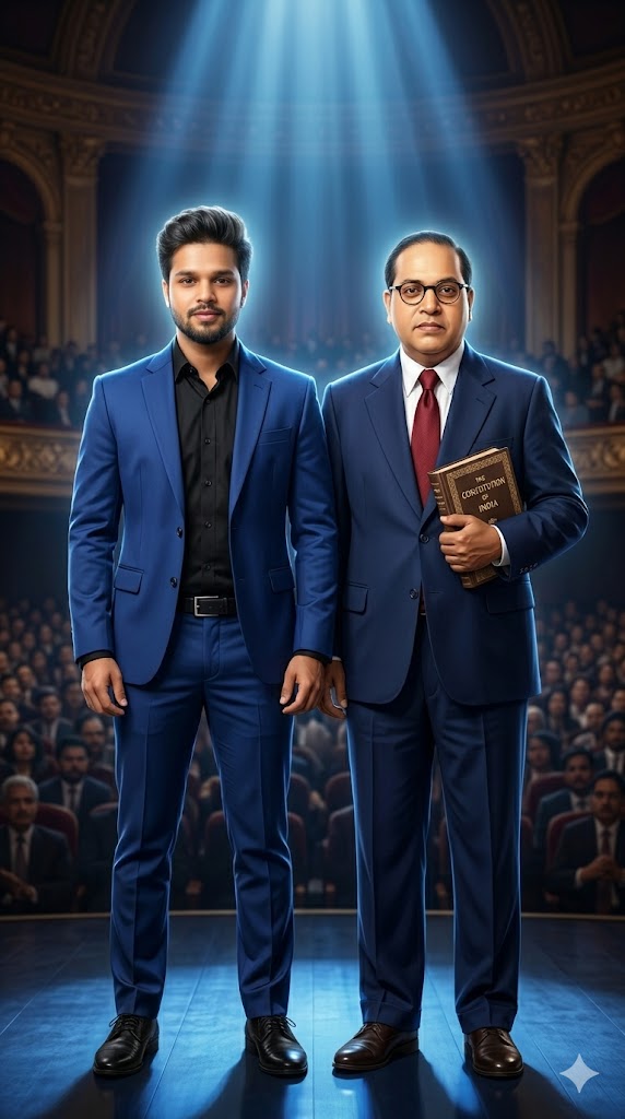A highly realistic cinematic portrait of a young Indian man standing beside B. R. Ambedkar on a grand stage, both facing directly toward the camera with confident expressions. The background features a dark auditorium with soft blue spotlight beams shining down, creating a dramatic tribute atmosphere. The young man is wearing a royal blue blazer, black shirt, and slim-fit trousers, with neatly styled hair and a light beard. Dr. Ambedkar is dressed in a classic blue suit, white shirt, and red tie, holding a book symbolizing the Constitution. Both subjects are standing upright with calm, respectful posture. The lighting highlights their faces sharply with a glowing aura effect around them. Ultra HD, 8K resolution, shallow depth of field, hyper-realistic skin texture, professional studio lighting, symmetrical composition, inspirational mood, sharp focus on faces, Take Face From Uploaded image Keep same 100%, aspect ratio 9:16