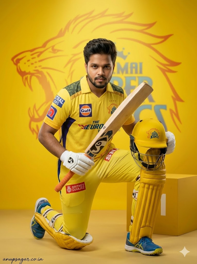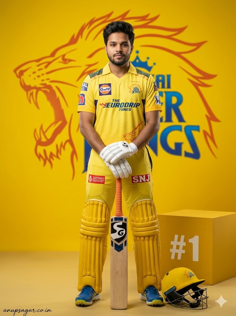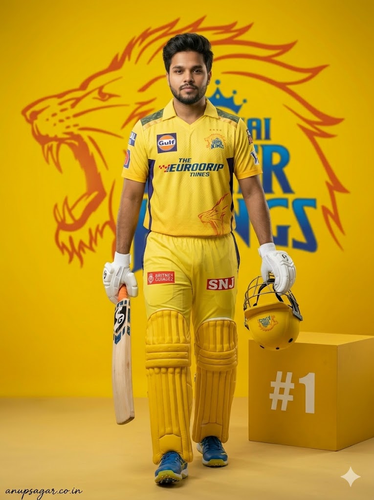 Create an ultra-realistic cinematic DSLR photograph recreating the SAME CSK cricket-themed scene with full-body visibility including shoes, maintaining exact realism and ZERO AI or edited appearance. The subject is an 18-year-old handsome young man with a slim, lean physique. His face remains EXACTLY identical—no modification allowed. Hairstyle remains the same textured side-swept quiff with natural strands and volume. FRAMING & CAMERA: Full-body shot, vertical composition, slight low angle using 50mm lens for cinematic presence. ASPECT RATIO • 3:4 vertical POSE (NEW – KNEELING READY POSE): Subject kneeling on one knee with the other leg forward. Bat placed diagonally across body with one hand gripping handle. Helmet resting on raised knee, held with other hand. Body slightly leaned forward showing readiness. EXPRESSION: Intense focused expression, game-ready mindset, eyes looking forward. OUTFIT (CSK THEME): — Yellow CSK jersey with detailed texture — Matching trousers with natural folds — White gloves — Full cricket pads clearly visible — Cricket shoes fully visible with detailed sole PROPS: — Bat angled with visible grain — Helmet resting on knee — All gear ultra-realistic BOX (NO GLOW): — Positioned slightly behind subject — Matte yellow tone — White “#1” subtle — Natural shadow BACKGROUND: — Bright yellow cinematic backdrop — Large CSK lion logo centered (slight blur) — Clean studio environment LIGHTING: — Soft front key light — Slight top light — Rim light for depth — Smooth shadow falloff COLOR GRADING: Warm golden-yellow cinematic tones with balanced contrast. DEPTH OF FIELD: Subject sharp from head to shoes, background softly blurred. FACE CLARITY — ULTRA HD MICRO DETAIL Face must be ultra-HD, crystal-clear with visible pores and exact identity preservation. STYLE Cinematic sports photography, ultra-realistic poster aesthetic. IMPORTANT HARD RULE Must look 100% real human photograph. NEGATIVE PROMPT face distortion, blur face, CGI, cartoon, extra limbs, wrong anatomy, low quality TEXT / SIGNATURE Add “anupsagar.co.in” at the bottom-left corner, HANDWRITTEN SIGNATURE-STYLE typography, thin cursive strokes, small size, subtle premium elegance, white or soft off-white color.
