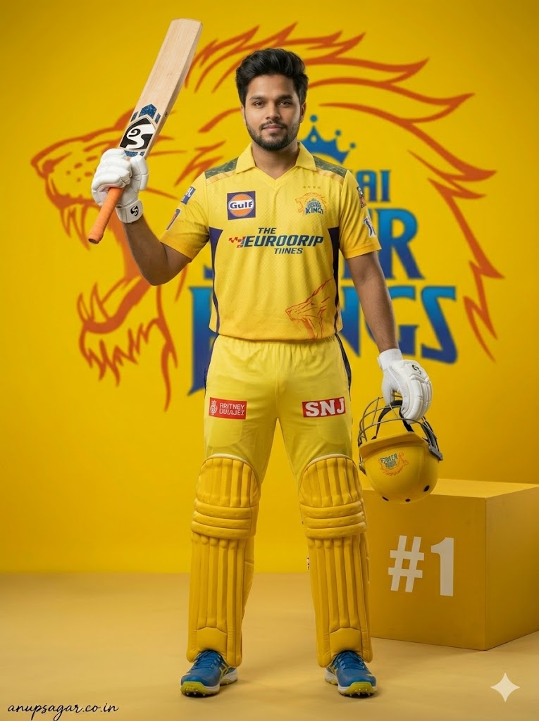 Create an ultra-realistic cinematic DSLR photograph recreating the SAME CSK cricket-themed scene with full-body visibility including shoes, maintaining exact realism and ZERO AI or edited appearance. The subject is an 18-year-old handsome young man with a slim, lean physique. His face remains EXACTLY identical—no modification allowed. Hairstyle remains the same textured side-swept quiff with natural strands and volume. FRAMING & CAMERA: Full-body shot, vertical composition, slight low angle using 50mm lens for dramatic cinematic framing. ASPECT RATIO • 3:4 vertical POSE (NEW – BAT RAISE VICTORY POSE): Standing firmly with legs slightly apart. Bat raised upward in one hand above shoulder level in a celebratory stance. Helmet held down in other hand near thigh. Body upright with open chest and strong posture. EXPRESSION: Proud confident expression with slight smile, victory moment captured. OUTFIT (CSK THEME): — Yellow CSK jersey with detailed texture — Matching trousers extending fully to ankles — White gloves — Full cricket pads visible — Cricket shoes fully visible with texture detail PROPS: — Bat raised with visible wood grain — Helmet held naturally — All gear ultra-realistic BOX (NO GLOW): — Positioned slightly behind subject — Matte yellow tone — Subtle “#1” — Natural shadow BACKGROUND: — Bright yellow cinematic backdrop — Large CSK lion logo centered behind (slight blur) — Clean studio feel LIGHTING: — Strong front key light — Soft top light — Rim light for separation — Smooth cinematic shadow depth COLOR GRADING: Rich yellow-gold tones with cinematic contrast and depth. DEPTH OF FIELD: Subject fully sharp, background slightly blurred. FACE CLARITY — ULTRA HD MICRO DETAIL Face must be ultra-HD, crystal-clear, with visible pores and exact identity match. STYLE Professional cricket poster, cinematic DSLR realism. IMPORTANT HARD RULE Must look 100% real human photograph. NEGATIVE PROMPT face distortion, blur face, CGI, cartoon, extra limbs, wrong anatomy, low quality TEXT / SIGNATURE Add “anupsagar.co.in” at the bottom-left corner, HANDWRITTEN SIGNATURE-STYLE typography, thin cursive strokes, small size, subtle premium elegance, white or soft off-white color.