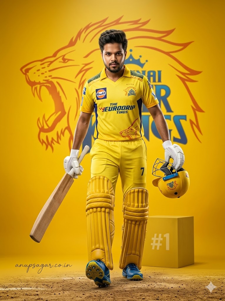 Create an ultra-realistic cinematic DSLR photograph recreating the SAME CSK cricket-themed scene with full-body visibility including shoes, maintaining exact realism and ZERO AI or edited appearance. The subject is an 18-year-old handsome young man with a slim, lean physique, narrow shoulders and waist. His face remains EXACTLY identical—no modification in facial structure, pores, skin texture, beard, or identity. Hairstyle remains strictly consistent: modern textured side-swept quiff with natural volume, messy controlled strands, matte finish, softly blended sides (NO fade). FRAMING & CAMERA: Full-body shot (head to shoes fully visible), vertical composition, slight low angle using 50mm cinematic lens for powerful hero perspective. ASPECT RATIO • 3:4 vertical POSE (NEW – WALKING CHAMPION POSE): The subject is walking forward confidently toward the camera. One foot stepping ahead, body slightly leaning forward. Bat held down in one hand near thigh level. Helmet carried in other hand swinging naturally. EXPRESSION: Calm confident expression with strong champion attitude, eyes focused directly at camera. OUTFIT (CSK THEME): — Yellow CSK jersey with ultra-realistic fabric texture — Matching trousers with natural folds — White batting gloves — Dark cricket pads fully visible — Cricket shoes clearly visible with sole grip detail PROPS: — Bat held naturally with visible wood grain — Helmet carried in hand — Full gear ultra-detailed BOX (NO GLOW): — Positioned behind subject — Matte yellow tone — White “#1” subtle — Natural floor shadow BACKGROUND: — Bright yellow cinematic background — Large CSK lion logo behind subject (slightly blurred) — Clean studio environment LIGHTING: — Soft key light illuminating full body — Top light for depth — Rim light outlining subject — Balanced cinematic shadows COLOR GRADING: Warm golden-yellow tones with high contrast and natural skin tones. DEPTH OF FIELD: Subject fully sharp from head to shoes, background slightly blurred. FACE CLARITY — ULTRA HD MICRO DETAIL Face must be ultra-HD, razor sharp, crystal-clear with visible pores and exact identity preservation. STYLE Cinematic cricket poster, ultra-realistic DSLR photography. IMPORTANT HARD RULE Must look like real photograph. NO AI artifacts. NEGATIVE PROMPT face change, blur face, CGI, cartoon, extra limbs, bad anatomy, low resolution TEXT / SIGNATURE Add “anupsagar.co.in” at the bottom-left corner, HANDWRITTEN SIGNATURE-STYLE typography, thin cursive strokes, small size, subtle premium elegance, white or soft off-white color.