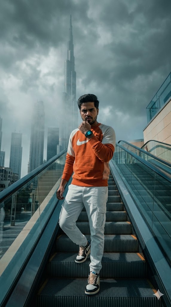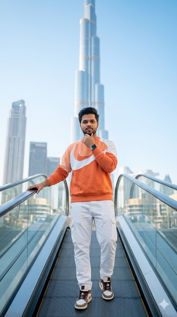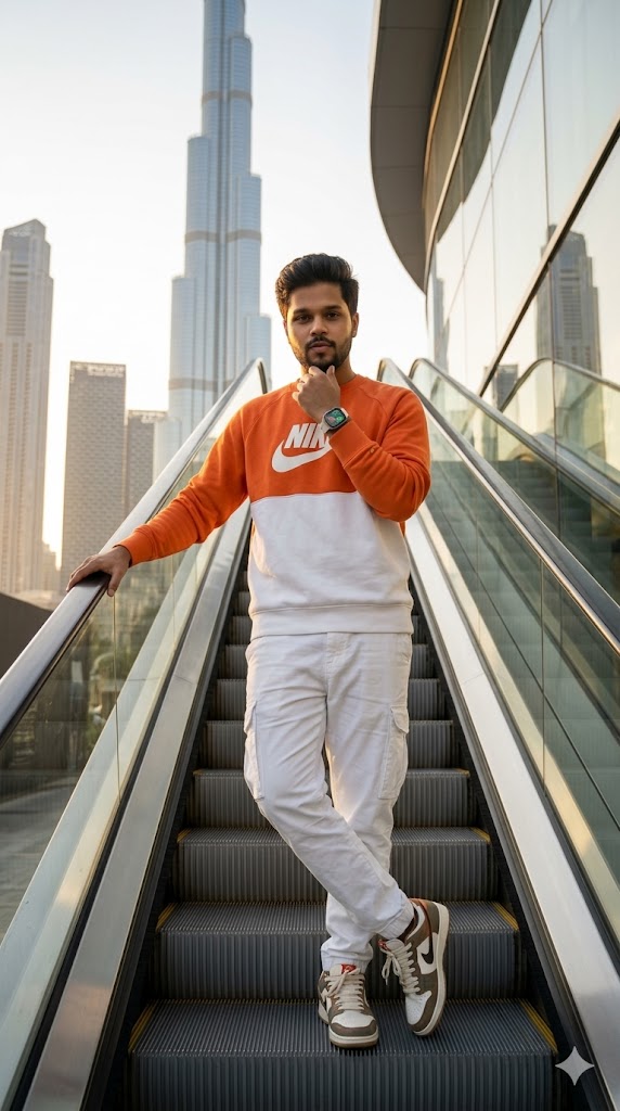 A high-end fashion editorial portrait of a stylish young Indian man standing confidently on a modern escalator in front of the Burj Khalifa, Dubai. He faces the camera with strong eye contact and a calm, powerful expression. He wears an orange and white Nike sweatshirt, white cargo pants, and premium sneakers. A smartwatch glows subtly on his wrist. One hand rests on the escalator rail while the other is near his chin in a thoughtful pose.
