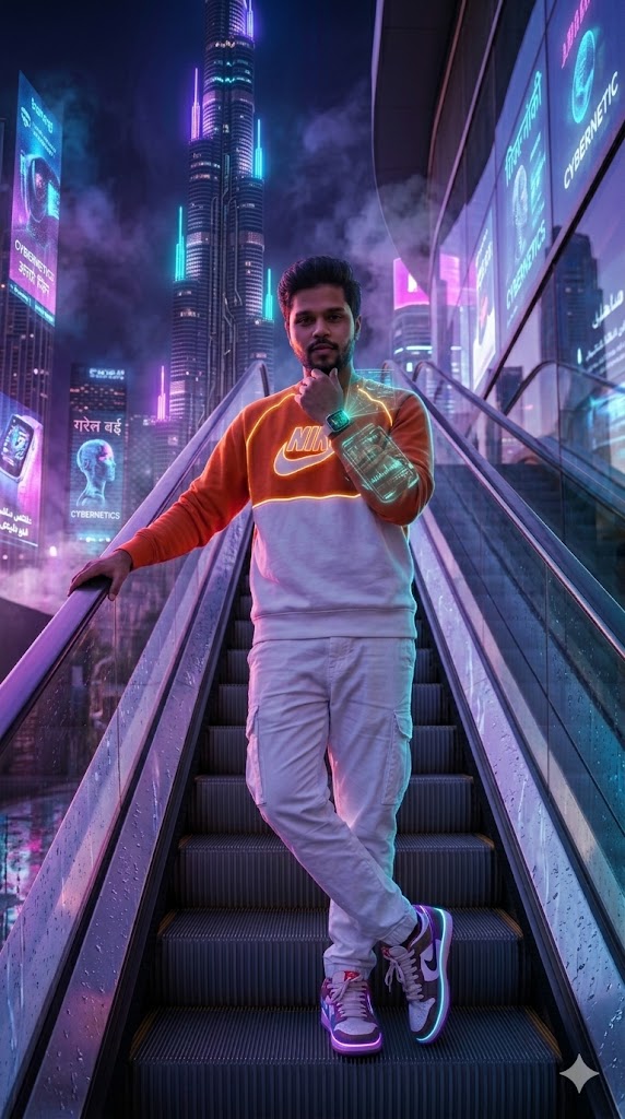 A futuristic cyberpunk version of Dubai with neon-lit skyscrapers and holographic advertisements glowing around Burj Khalifa. A stylish young Indian man stands confidently on a moving escalator, facing the camera with sharp eye contact and a bold expression.