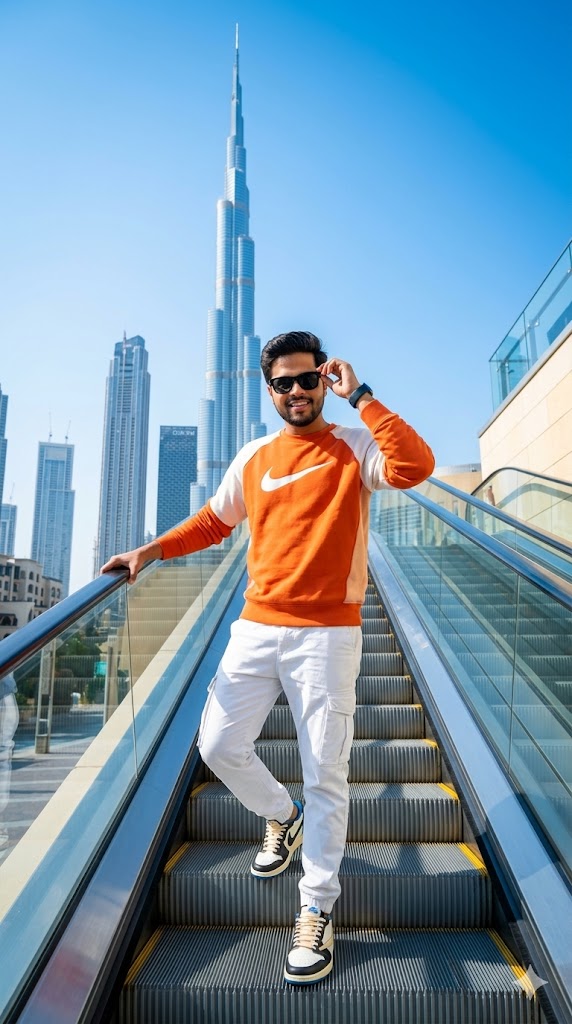 A vibrant travel influencer shot of a young Indian man standing on a modern escalator in Dubai with Burj Khalifa in the background. He is confidently looking straight into the camera with a relaxed smile and strong eye contact.