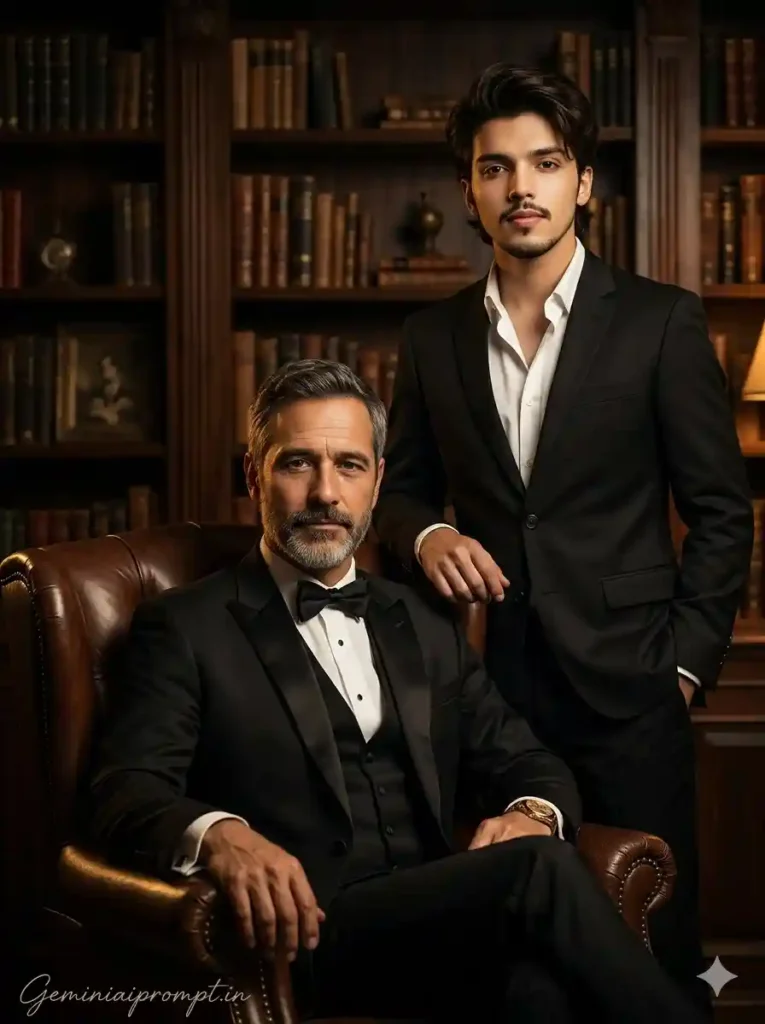 Create an ultra-realistic 8K cinematic studio portrait of a South Asian father and his 20-year-old son (use the uploaded reference image for exact faces, identity, and skin tones), styled in an elegant “Old Money” aesthetic inside a vintage library setting with dramatic chiaroscuro lighting and extreme face clarity. FACE LOCK — ZERO MODIFICATION POLICY Use the uploaded reference image for both faces. Faces must remain 100% identical. Preserve exact facial structure, jawline, cheekbones, nose, lips, and natural skin tone. No beautification, no smoothing, no reshaping. FACE CLARITY — EXTREME HD MASTER PRIORITY Both faces must be razor-sharp, ultra-HD, crystal-clear with visible pores, natural skin texture, and micro-details. No blur, no softness, no cinematic blur on faces. Faces must be the sharpest elements in the entire frame. ASPECT RATIO • 3:4 vertical STYLE Ultra-realistic cinematic studio photography, Old Money editorial style, chiaroscuro lighting, 8K ultra detail, rich contrast. SCENE A vintage library room with wooden bookshelves, leather-bound books, antique decor, and a dark polished wood environment. POSE • Father seated in a classic leather armchair • One hand resting on armrest, posture upright • Son (20-year-old) standing beside slightly behind • One hand resting lightly on chair back EXPRESSION • Father: calm authoritative expression • Son: composed confident look OUTFIT • Father: black three-piece tuxedo with bowtie + luxury gold watch • Son: slim-fit black suit with open collar shirt HAIR • Son: clean modern hairstyle • Father: neatly groomed LIGHTING • Warm amber spotlight from one side • Deep shadows for dramatic effect • Face clearly illuminated COLOR GRADING • Deep brown, gold, and black tones • High contrast cinematic look BACKGROUND • Bookshelves and antique textures • Soft blur for depth • Dark premium ambiance CAMERA & COMPOSITION • DSLR 85mm lens • Eye-level cinematic framing • Center-weight composition • Ultra sharp face focus MOOD & TONE • Old money • Powerful • Sophisticated • Cinematic NEGATIVE PROMPT face blur, identity change, plastic skin, CGI look, distortion, over-smoothing, low detail face TEXT / SIGNATURE Add “Geminiaiprompt.in” at the bottom-left corner, HANDWRITTEN SIGNATURE-STYLE typography, thin cursive strokes, small size, subtle premium elegance, white or soft off-white color.