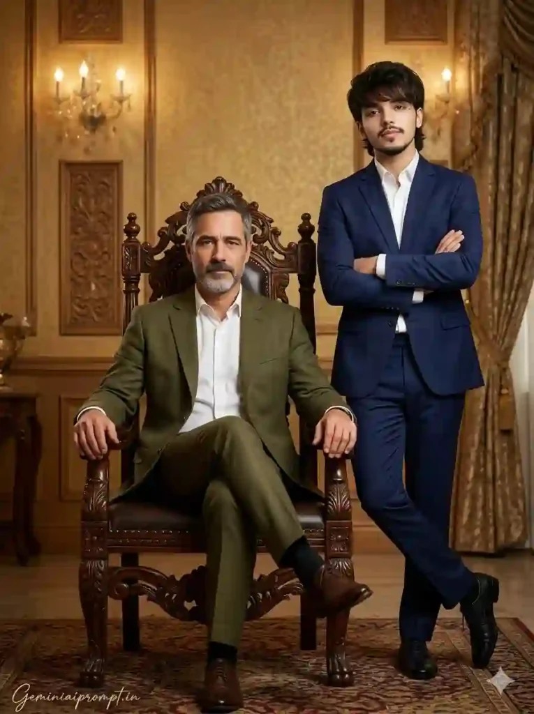 Create an ultra-realistic 8K full-body cinematic studio portrait of a father and his teenage son (use the uploaded reference image for exact faces, identity, and skin tones), styled in a luxurious royal interior setting with extreme face clarity and premium editorial finish. FACE LOCK — ZERO MODIFICATION POLICY Use the uploaded reference image for both father and son faces. Faces must remain 100% identical. Preserve exact facial structure, jawline, cheekbones, nose, lips, and skin tone. No beautification, no smoothing, no reshaping. FACE CLARITY — EXTREME HD MASTER PRIORITY Both faces must be razor-sharp, ultra-HD, crystal-clear with visible pores, natural skin texture, and micro facial details. No blur, no softness, no cinematic blur on faces. Faces must be the sharpest elements in the entire frame. ASPECT RATIO • 3:4 vertical STYLE Ultra-realistic DSLR studio photography, cinematic royal editorial look, 8K ultra detail, high-end color grading. SCENE A luxurious royal room with golden textured walls, carved wooden panels, chandeliers, and elegant ambient lighting creating a regal atmosphere. POSE • Father seated in an ornate dark wooden throne chair • Legs crossed, one hand resting on armrest • Son standing beside the chair slightly angled • Arms crossed with confident posture EXPRESSION • Father: calm authoritative expression • Son: confident modern attitude OUTFIT • Father: crisp white shirt + olive green traditional suit • Son: white shirt + deep navy blue suit HAIR • Clean styled hair with detailed strands LIGHTING • Soft studio lighting with warm highlights • Face evenly illuminated • Subtle shadow depth for realism BACKGROUND • Royal interior details • Slight blur for depth • Elegant textures visible CAMERA & COMPOSITION • DSLR 85mm lens • Centered cinematic framing • Full-body vertical composition • Face-focused ultra sharp rendering MOOD & TONE • Royal • Powerful • Elegant • Cinematic NEGATIVE PROMPT face blur, identity change, plastic skin, CGI look, distortion, over-smoothing, low detail face TEXT / SIGNATURE Add “Geminiaiprompt.in” at the bottom-left corner, HANDWRITTEN SIGNATURE-STYLE typography, thin cursive strokes, small size, subtle premium elegance, white or soft off-white color.