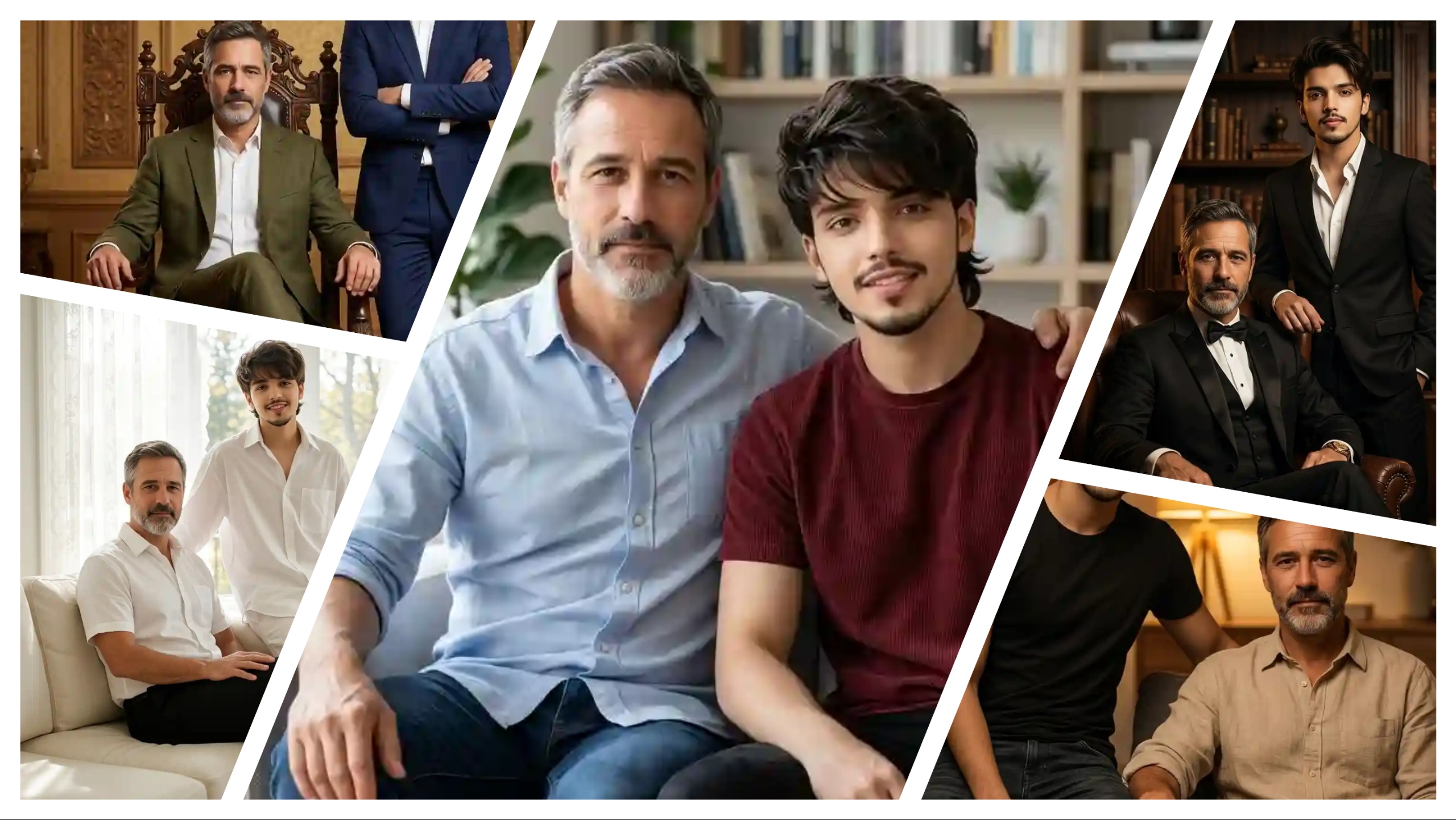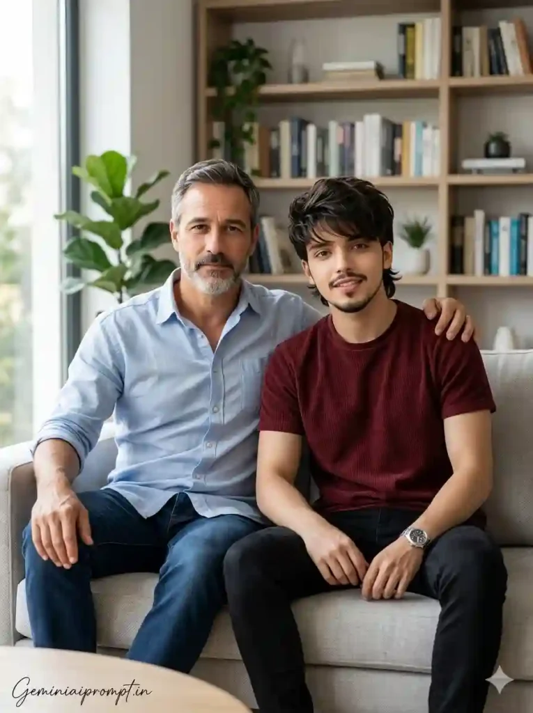 Create an ultra-realistic 8K cinematic indoor lifestyle portrait of a father and his 20-year-old son (use the uploaded reference image for exact faces, identity, and skin tones), sitting together on a modern sofa in a well-lit contemporary living room, designed with extreme face clarity and mature emotional bonding. FACE LOCK — ZERO MODIFICATION POLICY Use the uploaded reference image for both father and son faces. Faces must remain 100% identical. Preserve exact facial structure, jawline, cheekbones, nose, lips, and natural skin tone. No beautification, no smoothing, no reshaping. FACE CLARITY — EXTREME HD MASTER PRIORITY Both faces must be razor-sharp, ultra-HD, crystal-clear with visible pores, natural skin texture, and micro facial details. No blur, no softness, no cinematic blur on faces. Faces must be the sharpest elements in the image. ASPECT RATIO • 3:4 vertical STYLE Ultra-realistic DSLR lifestyle photography, cinematic indoor portrait, 8K ultra detail, soft warm tones, premium Instagram-ready finish. SCENE A modern stylish living room with large window, soft curtains, indoor plants, bookshelf, and minimal aesthetic decor creating a clean premium environment. POSE • Father sitting comfortably on sofa • One arm resting behind son on sofa back • Son (20-year-old) sitting beside him slightly leaning forward • Relaxed confident posture EXPRESSION • Father: calm, proud, composed expression • Son: confident relaxed smile with mature vibe OUTFIT • Father: pastel casual shirt (rolled sleeves) + dark jeans • Son: fitted t-shirt or casual shirt + slim-fit jeans + sneakers HAIR • Son: modern styled hair (clean, slightly textured) • Father: natural groomed look LIGHTING • Soft natural daylight entering from window • Gentle highlights on faces • Realistic soft shadows BACKGROUND • Indoor plants • Bookshelf • Minimal decor • Slight cinematic blur for depth CAMERA & COMPOSITION • DSLR 50mm lens • Eye-level lifestyle framing • Face-focused ultra sharp rendering • Shallow depth-of-field MOOD & TONE • Mature bonding • Calm • Stylish • Cinematic NEGATIVE PROMPT face blur, identity change, plastic skin, CGI look, distortion, over-smoothing, low detail face TEXT / SIGNATURE Add “Geminiaiprompt.in” at the bottom-left corner, HANDWRITTEN SIGNATURE-STYLE typography, thin cursive strokes, small size, subtle premium elegance, white or soft off-white color.