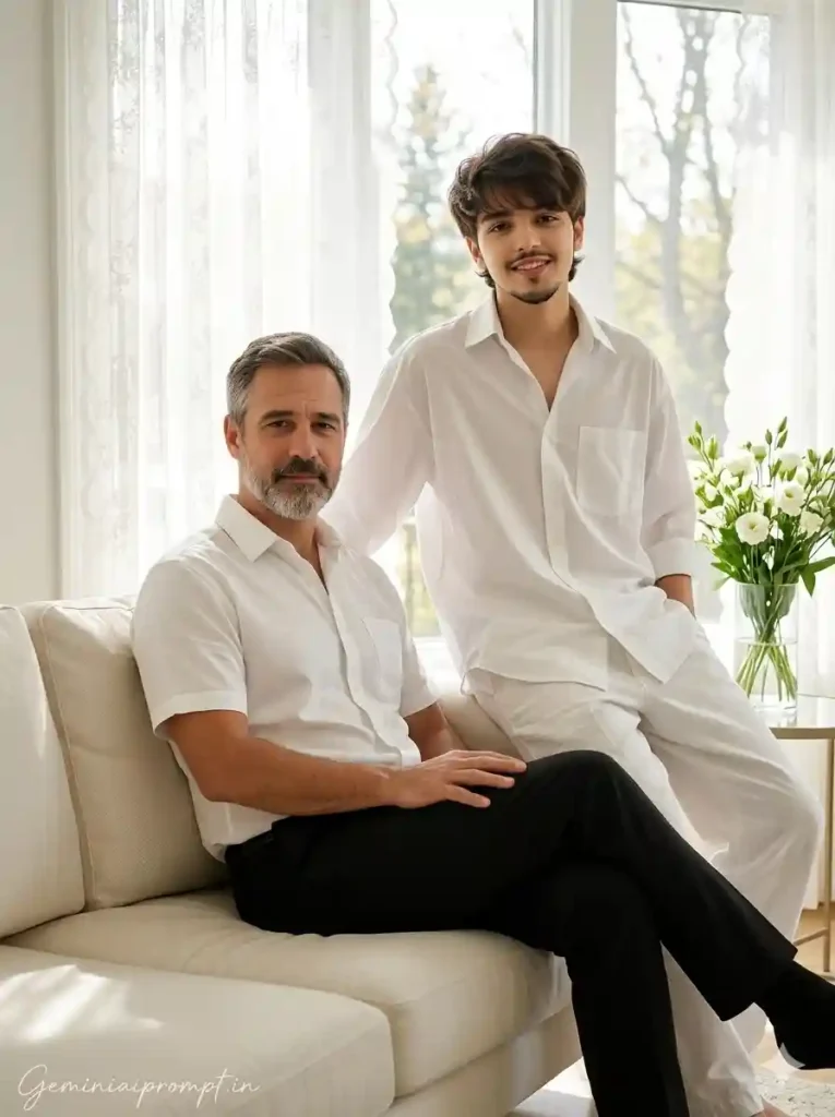 Create an ultra-realistic 8K cinematic portrait of a father and his teenage son (use the uploaded reference image for exact faces, identity, and skin tones) inside a bright modern living room, designed with extreme face clarity and emotional warmth. FACE LOCK — ZERO MODIFICATION POLICY Use the uploaded reference image for both father and son faces. Faces must remain 100% identical. Preserve exact facial structure, jawline, cheekbones, nose, lips, and skin tone. No beautification, no smoothing, no reshaping. FACE CLARITY — EXTREME HD MASTER PRIORITY Both faces must be razor-sharp, ultra-HD, crystal-clear with visible pores, natural skin texture, and micro-details. No blur, no softness, no cinematic blur on faces. Faces must be the sharpest elements in the image. ASPECT RATIO • 3:4 vertical STYLE Ultra-realistic DSLR lifestyle photography, cinematic indoor portrait, 8K ultra detail, natural warm tones. SCENE A bright modern living room with large window, soft white curtains, natural daylight flowing inside, and minimal elegant furniture. POSE • Father seated on sofa • One hand resting on lap • Son standing slightly behind, leaning gently on sofa • Natural relaxed posture EXPRESSION • Father: calm, proud, peaceful expression • Son: warm confident smile OUTFIT • Father: white short-sleeve shirt + black trousers • Son: oversized white shirt + loose white pants HAIR • Natural clean hairstyle with fine detail LIGHTING • Soft natural daylight from window • Gentle highlights on faces • Balanced shadows BACKGROUND • Lace curtains • Minimal decor • Slight blur for depth EXTRA DETAILS • Decorative vase with white flowers and green leaves on side table • Clean premium indoor environment CAMERA & COMPOSITION • DSLR 85mm lens • Eye-level framing • Face-focused composition • Ultra sharp rendering MOOD & TONE • Warm • Emotional • Peaceful • Family bonding NEGATIVE PROMPT face blur, identity change, plastic skin, CGI look, distortion, over-smoothing, low detail face TEXT / SIGNATURE Add “Geminiaiprompt.in” at the bottom-left corner, HANDWRITTEN SIGNATURE-STYLE typography, thin cursive strokes, small size, subtle premium elegance, white or soft off-white color.