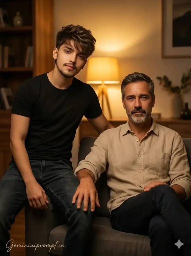 Create an ultra-realistic 8K cinematic indoor lifestyle portrait of a father and his 20-year-old son (use the uploaded reference image for exact faces, identity, and skin tones), captured in a cozy evening indoor setting with warm golden lamp lighting and ultra-HD face clarity. FACE LOCK — ZERO MODIFICATION POLICY Use the uploaded reference image for both father and son faces. Faces must remain 100% identical. Preserve exact facial structure, jawline, cheekbones, nose, lips, and natural skin tone. No beautification, no smoothing, no reshaping. FACE CLARITY — EXTREME HD MASTER PRIORITY Both faces must be razor-sharp, ultra-HD, crystal-clear with visible pores, natural skin texture, and micro facial details. No blur, no softness, no cinematic blur on faces. Faces must be the sharpest elements in the image. ASPECT RATIO • 3:4 vertical STYLE Ultra-realistic cinematic indoor photography, warm cozy editorial style, 8K ultra detail, golden color grading. SCENE A dimly lit modern living room with a warm table lamp, wooden textures, soft sofa, and minimal decor creating a premium evening atmosphere. POSE • Father sitting relaxed on sofa • One hand resting on armrest • Son (20-year-old) sitting on arm of sofa slightly leaning forward • Casual but stylish positioning EXPRESSION • Father: calm thoughtful look • Son: relaxed confident expression OUTFIT • Father: beige/light brown shirt + dark trousers • Son: black t-shirt + denim jeans HAIR • Son: textured modern hairstyle • Father: natural groomed hair LIGHTING • Warm golden lamp light • Soft shadows • Face evenly lit with cinematic glow COLOR GRADING • Warm amber and golden tones • Cozy evening cinematic feel BACKGROUND • Lamp glow • Soft shadows • Minimal decor • Slight blur for depth CAMERA & COMPOSITION • DSLR 85mm lens • Eye-level cinematic framing • Face-focused ultra sharp rendering • Shallow depth-of-field MOOD & TONE • Cozy • Emotional • Stylish • Cinematic NEGATIVE PROMPT face blur, identity change, plastic skin, CGI look, distortion, over-smoothing, low detail face TEXT / SIGNATURE Add “Geminiaiprompt.in” at the bottom-left corner, HANDWRITTEN SIGNATURE-STYLE typography, thin cursive strokes, small size, subtle premium elegance, white or soft off-white color.