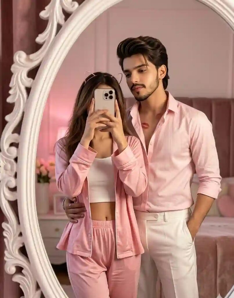 Create an ultra-realistic 8K cinematic mirror selfie portrait of a stylish couple in a luxurious coquette-themed bedroom (use uploaded reference image for exact faces and identity), designed with ultra-HD face clarity and premium editorial aesthetic. FACE LOCK — ZERO MODIFICATION POLICY Use the uploaded reference image for both faces. Faces must remain 100% identical. Maintain exact identity, facial proportions, and natural expressions. No beautification or alteration. FACE CLARITY — MAXIMUM SHARPNESS MODE Male face must be extremely sharp, ultra-HD, with crisp edges, visible pores, beard detail, and natural texture. No blur, no softness, no glow on face. Face must be the clearest element in the image. ASPECT RATIO • 3:4 vertical STYLE Ultra-realistic cinematic lifestyle photography, luxury mirror editorial, 8K detail. SCENE A vintage-inspired bedroom with ornate white mirror frame, soft pink lighting, velvet textures, and aesthetic decor elements. POSE • Woman holding phone in front of face • Slight body tilt • Man standing close behind • One hand on her waist • Other hand in pocket • Man looking toward phone reflection EXPRESSION • Man: confident relaxed look • Woman: natural selfie pose OUTFIT • Woman: coquette-style pink pajama + white crop top + cat ears • Man: light pink shirt + white trousers DETAILS • Lipstick mark on chest clearly visible • Clothing folds and textures realistic HAIR • Woman: soft long hair • Man: clean styled hair + beard LIGHTING • Soft warm + slight golden tint • Face evenly lit • No shadow distortion COLOR GRADING • Pink + gold tones • Premium cinematic finish BACKGROUND • Plush decor • Soft pastel elements • Slight blur depth CAMERA & COMPOSITION • Mirror-centered framing • DSLR 50mm lens • Ultra sharp face rendering • Balanced composition MOOD & TONE • Romantic • Luxury • Stylish • Aesthetic NEGATIVE PROMPT face blur, identity mismatch, plastic skin, CGI look, distortion, extra limbs, low resolution, lighting errors TEXT / SIGNATURE Add “Geminiaiprompt.in” at the bottom-left corner, HANDWRITTEN SIGNATURE-STYLE typography, thin cursive strokes, small size, subtle premium elegance, white or soft off-white color.