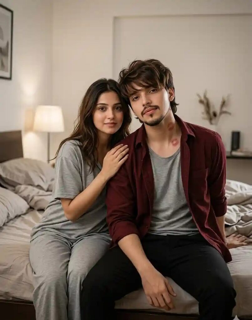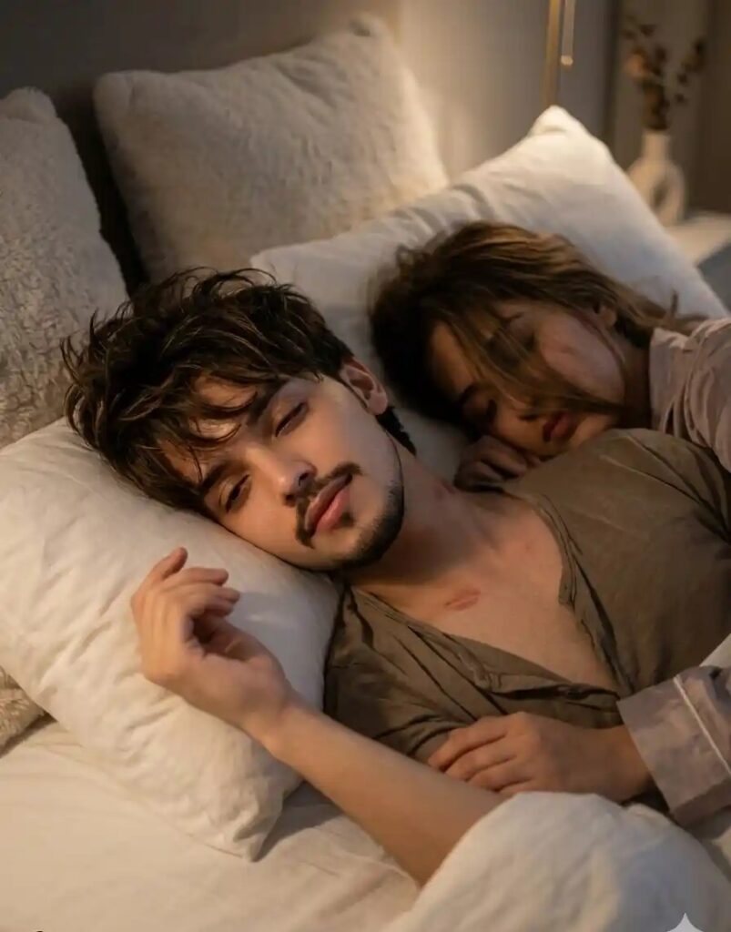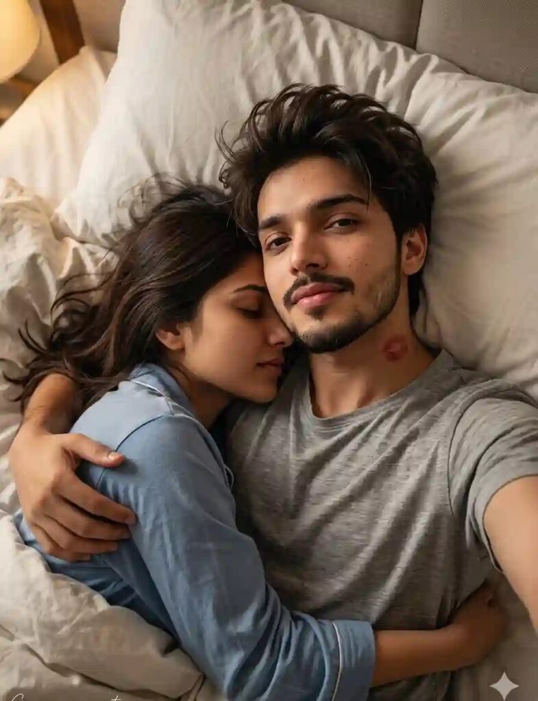 Create an ultra-realistic 8K cinematic bedroom portrait of a couple (use the uploaded reference image for exact faces, identity, and skin tones), captured in a realistic lying-down moment on a bed, designed to look completely natural and real for a romantic prank scenario. FACE LOCK — ZERO MODIFICATION POLICY Use the uploaded reference image for both faces. Faces must remain 100% identical. Preserve exact facial structure, jawline, beard details, nose, lips, and natural skin tone. No beautification, no smoothing, no reshaping. FACE CLARITY — EXTREME HD PRIORITY Male face must be razor-sharp, ultra-HD, crystal-clear with visible pores, beard texture, and natural skin details. No blur, no softness, no glow distortion. Face must be the sharpest element even in lying pose. ASPECT RATIO • 3:4 vertical STYLE Ultra-realistic cinematic lifestyle photography, bedroom candid style, 8K ultra detail, RAW natural look. SCENE A soft cozy bedroom with white bedsheets, fluffy pillows, dim warm lighting, and a relaxed intimate atmosphere. POSE • Man lying on bed slightly sideways • Head resting on pillow • One hand relaxed near chest • Woman lying close beside him, partially visible • Natural sleeping/casual resting posture EXPRESSION • Man: relaxed natural expression (eyes slightly closed or soft look) • Woman: face partially hidden (realistic candid vibe) OUTFIT • Man: casual t-shirt or open shirt • Woman: soft nightwear / pajama DETAILS (PRANK ELEMENT) • Visible subtle love bite (hickey) on neck or collarbone • Skin texture must remain natural and realistic • No artificial marks — must look real HAIR • Natural messy bed hair • Realistic strands LIGHTING • Soft warm bedside lamp light • Low light but face clearly visible • No noise or blur COLOR GRADING • Warm cozy tones • Natural cinematic feel BACKGROUND • Pillows, bedsheets • Minimal decor • Slight blur depth CAMERA & COMPOSITION • DSLR 50mm lens • Slight top-angle candid shot • Face-focused ultra sharp rendering MOOD & TONE • Intimate • Realistic • Cozy • Prank-ready NEGATIVE PROMPT face blur, identity change, plastic skin, CGI look, fake marks, over-smoothing, low resolution TEXT / SIGNATURE Add “Geminiaiprompt.in” at the bottom-left corner, HANDWRITTEN SIGNATURE-STYLE typography, thin cursive strokes, small size, subtle premium elegance, white or soft off-white color.