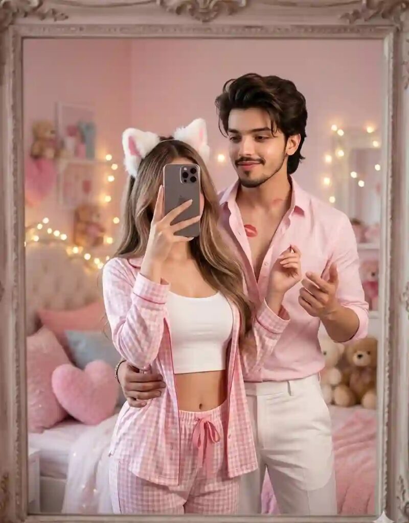 Create an ultra-realistic 8K cinematic mirror selfie portrait of a stylish couple in a playful coquette-themed bedroom (use the uploaded reference image for exact faces, identity, and skin tones), designed with extreme face clarity and a cute prank-style romantic vibe. FACE LOCK — ZERO MODIFICATION POLICY Use the uploaded reference image for both faces. Faces must remain 100% identical. Preserve exact facial structure, beard details, jawline, nose, lips, and natural skin tone. No beautification, no smoothing, no reshaping. FACE CLARITY — EXTREME HD PRIORITY Male face must be razor-sharp, ultra-HD, crystal-clear with visible pores, beard texture, and natural skin detail. No blur, no softness, no glow on face. Face must be the sharpest element in the image. ASPECT RATIO • 3:4 vertical STYLE Ultra-realistic cinematic lifestyle photography, mirror selfie aesthetic, playful coquette vibe, 8K ultra detail. SCENE A soft pink aesthetic bedroom filled with plush pillows, fairy lights, heart-shaped cushions, pastel decor, and cute romantic styling. POSE • Woman holding phone covering her face (mirror selfie) • Slight playful tilt pose • Man standing behind her closely • One hand around her waist • Other hand slightly raised making a playful gesture • Man looking toward the phone EXPRESSION • Man: playful smirk (prank vibe) • Woman: hidden face selfie pose OUTFIT • Woman: pink-white pajama set + crop top + fuzzy cat ears • Man: light pink shirt slightly unbuttoned + white trousers DETAILS • Light lipstick kiss mark visible on chest • Natural clothing folds and texture HAIR • Woman: soft long hair • Man: styled hair + beard LIGHTING • Warm fairy lights + soft indoor glow • Face clearly lit • No blur COLOR GRADING • Soft pink + warm tones • Cute romantic aesthetic BACKGROUND • Teddy bears • Heart decor • Fairy lights • Slight blur for depth CAMERA & COMPOSITION • Mirror-centered selfie framing • DSLR 50mm lens style • Ultra sharp face rendering MOOD & TONE • Cute • Playful • Romantic • Prank-style fun NEGATIVE PROMPT face blur, identity change, plastic skin, CGI look, distortion, over-smoothing TEXT / SIGNATURE Add “Geminiaiprompt.in” at the bottom-left corner, HANDWRITTEN SIGNATURE-STYLE typography, thin cursive strokes, small size, subtle premium elegance, white or soft off-white color.