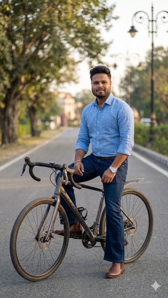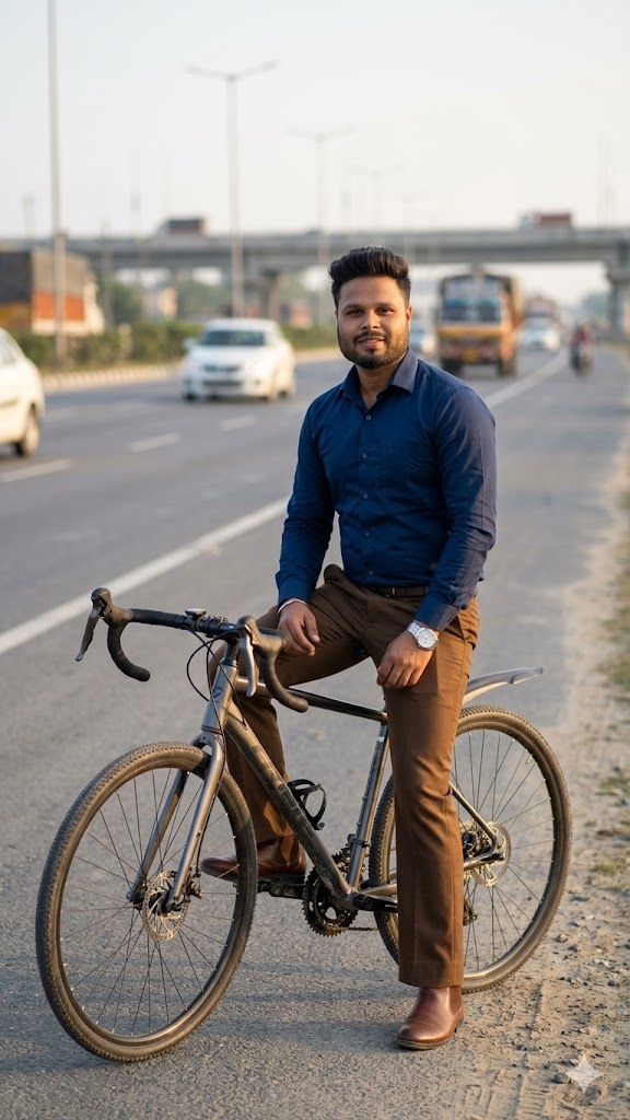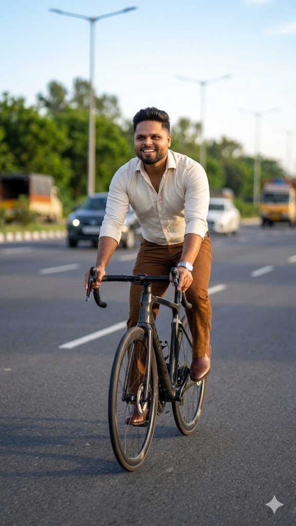 A hyper-realistic full-body shot of a handsome young man sitting on a bicycle on a wide 4-lane city highway. He is wearing a perfectly fitted formal shirt tucked into fitted bootcut trousers, styled with premium leather boots and a sleek luxury watch. He has a subtle, natural smile and is posing in a cool, funky manner. The background shows a vast, out-of-city main road with a heavy cinematic bokeh (blur) effect. The lighting is golden-hour cinematic style, highlighting his facial features with ultra-high-definition clarity. 8k resolution, photorealistic, sharp focus, shot on 85mm lens. Don't change faces