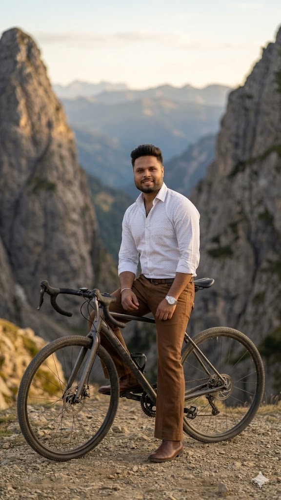 Ultra-realistic full-body shot of a stylish young man standing on a high mountain ridge between two massive peaks. He is wearing a perfectly fitted button-down shirt, tailored bootcut trousers, leather boots, and a luxury wristwatch. He is posing with a trendy bicycle in a cool, funky stance with a slight, natural smile. The background features a dramatic, out-of-focus (bokeh) mountain landscape with deep valleys. Cinematic golden hour lighting, sharp facial features, 8k resolution, shot on a 85mm lens for a professional photography look, highly detailed textures, photorealistic. Don't change faces