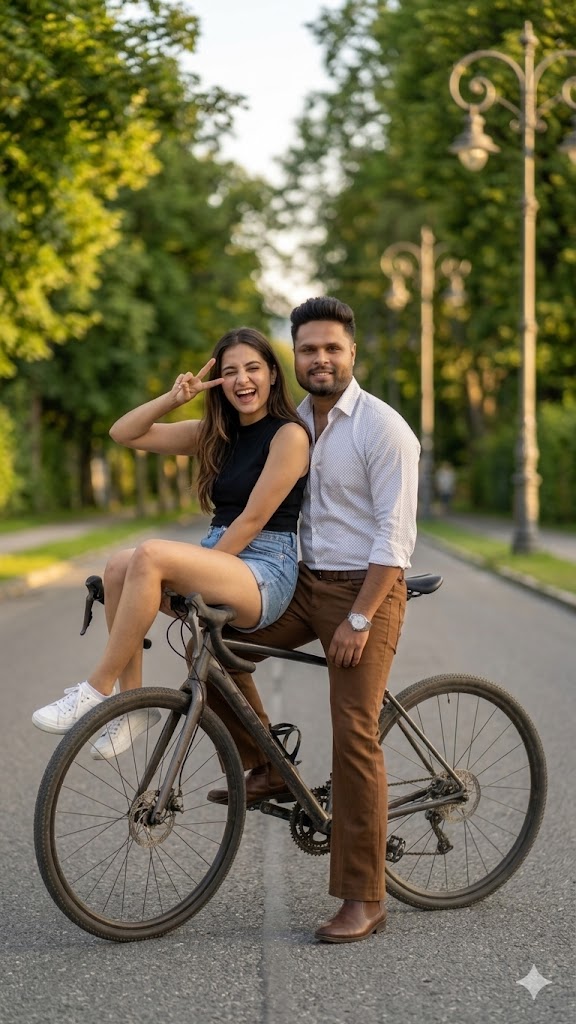 A hyper-realistic ultra-HD cinematic shot of a stylish young man and a young woman on a sports bicycle. The man, with a highly detailed and realistic face, is wearing a well-fitted shirt, fitted bootcut pants, a premium wristwatch, and stylish boots. He is sitting on the bicycle, stopped on a main road, giving a subtle, natural smile. A young woman is sitting on the front frame/handlebar area of the bike, wearing a trendy sleeveless outfit, striking a funky and playful pose. The background features a long road lined with lush green trees and vintage street light poles, all rendered with a soft, creamy bokeh (blurred) effect. High-end camera photography style, 8k resolution, natural cinematic lighting, sharp focus on the subjects, vibrant colors, and professional depth of field. Don't change faces