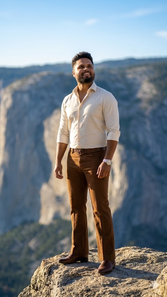Hyper-realistic full-body shot of a stylish young man standing on a high rocky cliff or hilltop. He is wearing a well-fitted formal shirt tucked into tailored bootcut trousers, paired with classic leather boots and a premium wristwatch. He is posing in a cool, "funky" stance, looking upwards with a slight, natural smile. The photo is captured from a high-angle "bird's-eye" perspective, looking down at him. The background is a beautifully soft-blurred natural landscape, creating a deep bokeh effect. Cinematic lighting, sharp facial features, 8k resolution, ultra-HD, incredibly detailed skin textures, and professional photography style. Don't change faces