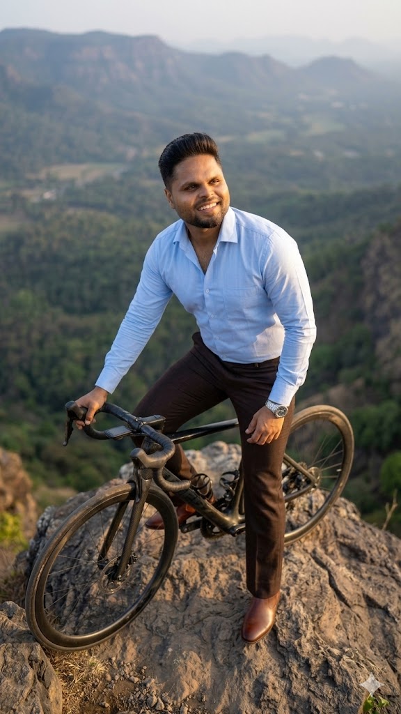 A hyper-realistic full-body shot of a handsome young man sitting on a modern sports bicycle, captured from a high-angle perspective. He is wearing a well-fitted formal shirt tucked into fitted bootcut trousers, paired with stylish leather boots and a premium wristwatch. He is posing in a funky, confident manner, looking upwards with a slight, natural smile. The setting is a high, scenic hilltop. The background is beautifully blurred with a deep bokeh effect, emphasizing the subject. The lighting is cinematic, featuring soft golden hour tones that highlight his clear facial features and the textures of his clothing. 8k resolution, ultra-HD, photorealistic, shot on 35mm lens. Don't change faces