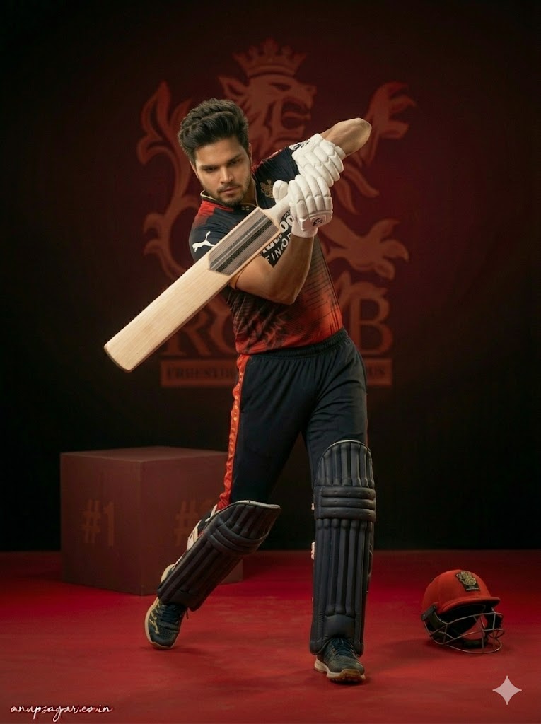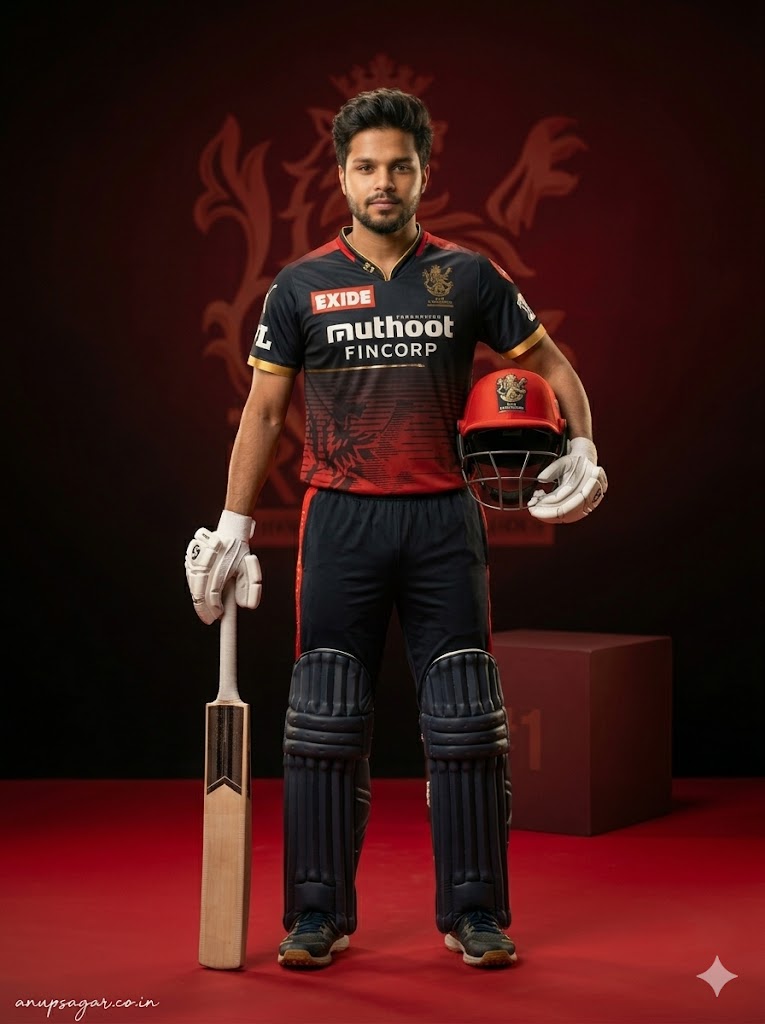 Create an ultra-realistic cinematic DSLR photograph recreating the SAME cricket-themed environment but now themed for RCB (Royal Challengers Bangalore) in a NEW helmet-focused stance, maintaining full-body visibility including shoes and seamless background-floor color matching, with ZERO AI or edited appearance. The subject is an 18-year-old handsome young man with a slim, lean physique. Face remains EXACTLY identical with no changes. Hairstyle remains the same textured side-swept quiff with natural volume and realistic strands. FRAMING & CAMERA: Full-body shot, vertical composition, slightly low angle using 50mm lens for strong cinematic framing. ASPECT RATIO • 3:4 vertical POSE (NEW – HELMET POWER POSE): Standing firmly with one leg slightly forward. Helmet held close to face at chest level with one hand, partially tilted outward. Bat held downward in the other hand, touching ground lightly. Body slightly angled toward camera. EXPRESSION: Intense focused expression, eyes locked forward, strong and fearless look. OUTFIT (RCB THEME): — Black-red jersey with gold detailing — Matching trousers with realistic folds — White gloves — Full cricket pads visible — Cricket shoes fully visible with texture detail PROPS: — Helmet held near chest with reflections — Bat grounded with visible wood grain — All equipment ultra-realistic BOX (NO GLOW – MINIMAL PRESENCE): — Slightly behind subject — Matte red tone — Subtle “#1” marking — Natural shadow BACKGROUND + FLOOR (MATCHED COLOR): — Deep red-black cinematic background — Seamless floor color match — Large RCB logo centered (slightly blurred) LIGHTING: — Dramatic front light — Soft top light — Rim light for separation — Controlled shadows for cinematic depth COLOUR GRADING: Warm red-black tones with high contrast and premium finish. DEPTH OF FIELD: Subject fully sharp, background slightly blurred. FACE CLARITY — ULTRA HD MICRO DETAIL Face must be ultra-HD, crystal-clear, with visible pores and exact identity preservation. STYLE Cinematic cricket poster, ultra-realistic DSLR photography. IMPORTANT HARD RULE Must look 100% real. NO artificial look. NEGATIVE PROMPT face distortion, blur face, CGI, cartoon, extra limbs, wrong proportions, low quality TEXT / SIGNATURE Add “anupsagar.co.in” at the bottom-left corner, HANDWRITTEN SIGNATURE-STYLE typography, thin cursive strokes, small size, subtle premium elegance, white or soft off-white color.