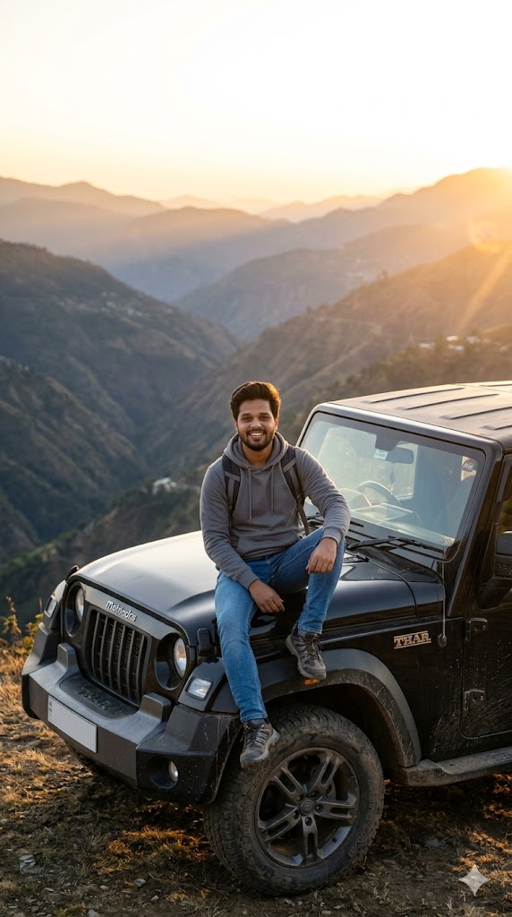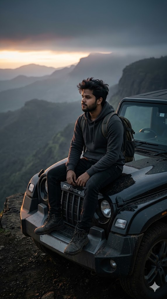 A hyper-realistic cinematic image of an Indian male traveler with a 100% identical face from the uploaded reference image, sitting on the bonnet of a matte black Mahindra Thar at a remote hilltop viewpoint. The boy has natural tan skin, slightly tousled messy hair, and a calm yet confident smile, reflecting a true explorer personality.