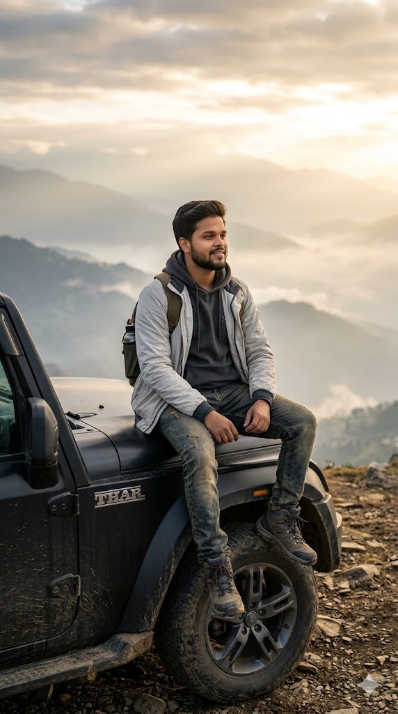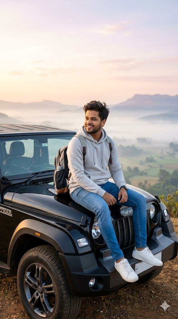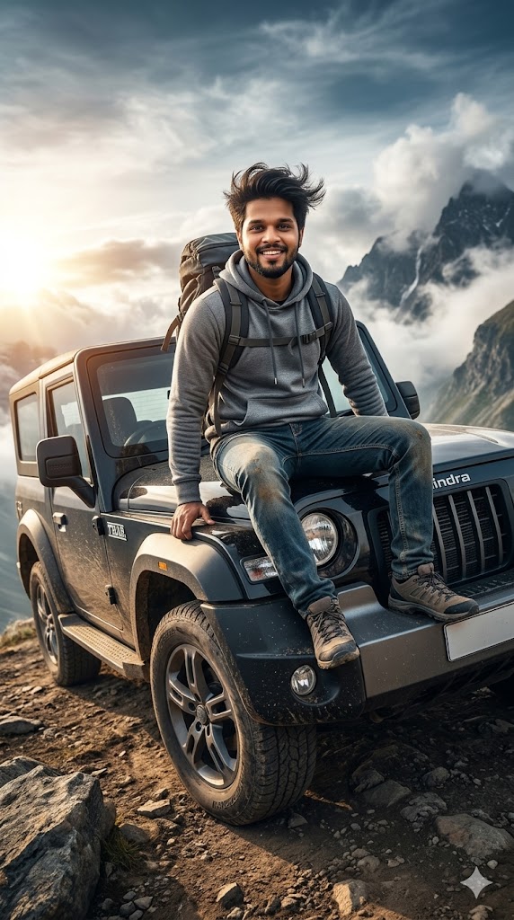 An ultra-realistic cinematic portrait of an Indian boy with a 100% identical face from the uploaded image, sitting confidently on the bonnet of a black Mahindra Thar parked at a high mountain viewpoint. He has tan skin, slightly messy wind-blown hair, and a joyful expressive smile showing excitement and freedom. He is wearing a stylish gray hoodie, slim blue jeans, trekking shoes, and a lightweight backpack, giving a true traveler and explorer aesthetic.