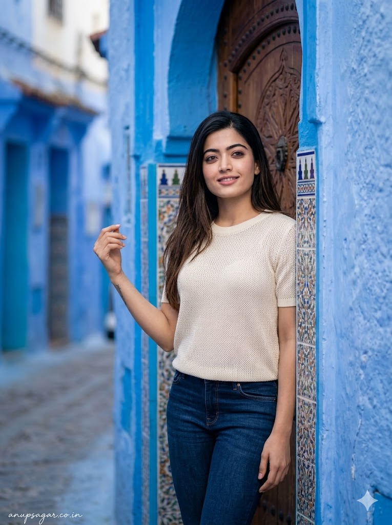 Create a full-body ultra-realistic cinematic travel portrait of a graceful woman standing in front of a traditional blue Moroccan doorway in Chefchaouen, designed with extreme face clarity priority and ultra-HD detail. FACE LOCK — ZERO MODIFICATION POLICY Use the uploaded reference image for the woman’s face. Face must remain 100% identical. Preserve exact eyes, nose, lips, cheeks, skin tone, and proportions. No beautification, no smoothing, no reshaping. FACE CLARITY — MAXIMUM HD PRIORITY Face must be razor-sharp, ultra-HD, crystal-clear with visible skin pores, micro-details, and natural texture. No blur, no softness, no depth blur affecting face. Face must be the sharpest and most detailed element in the entire image. ASPECT RATIO • 3:4 vertical STYLE Ultra-realistic DSLR travel photography, high sharpness, cinematic composition, 8K ultra detail, natural colors. SCENE A narrow blue street with a traditional Moroccan carved wooden door, textured walls in layered blue tones, and small decorative tiles around the doorway. POSE • Standing still near doorway • One shoulder slightly leaning against wall • One hand lightly touching door frame • Stable posture (no motion blur) EXPRESSION Soft confident smile, looking slightly toward natural light OUTFIT Modern tourist outfit • Stylish casual clothing (top + jeans or long dress) • Natural realistic fabric texture HAIR • Clean natural hair, no motion blur LIGHTING • Soft natural daylight hitting face directly • Even lighting on face (no shadow distortion) • Balanced highlights BACKGROUND • Blue textured walls and wooden door • Slight blur only in far background • Subject clearly separated CAMERA & COMPOSITION • DSLR 85mm lens • Tight focus on face • Slight portrait zoom for clarity • Full-body vertical frame with sharp subject NEGATIVE PROMPT face blur, soft focus, low detail face, identity change, plastic skin, CGI look, motion blur, distortion TEXT / SIGNATURE Add “anupsagar.co.in” at the bottom-left corner, HANDWRITTEN SIGNATURE-STYLE typography, thin cursive strokes, small size, subtle premium elegance, white or soft off-white color.