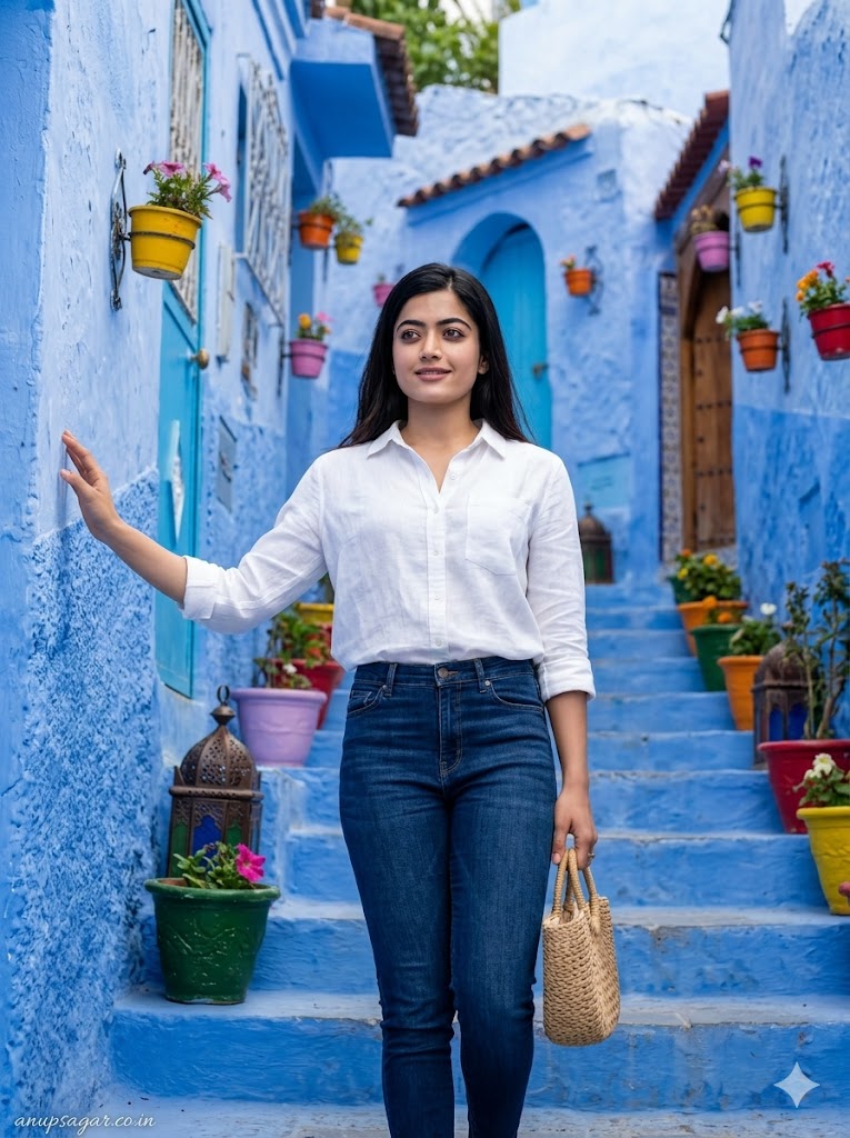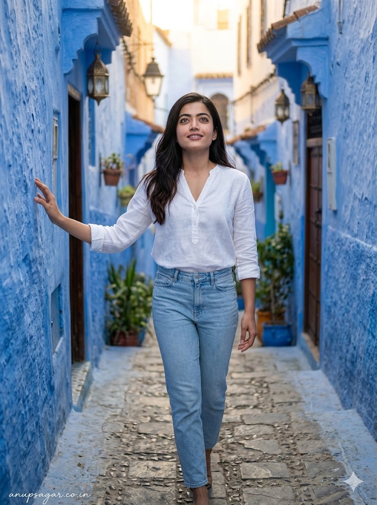 Create a full-body ultra-realistic cinematic travel photograph of a graceful woman walking through the iconic blue-painted streets of Chefchaouen, Morocco, with extreme face clarity priority and ultra-HD detail. FACE LOCK — ZERO MODIFICATION POLICY Use the uploaded reference image for the woman’s face. Face must remain 100% identical. Do not change facial structure, eyes, nose, lips, skin tone, or proportions. No beautification, no smoothing, no reshaping. FACE CLARITY — HIGHEST PRIORITY Face must be razor-sharp, ultra-HD, crystal-clear with visible skin texture, pores, fine details. No blur, no softness, no motion blur on face. Face must be the sharpest and highest resolution element in the entire image. ASPECT RATIO • 3:4 vertical STYLE Ultra-realistic DSLR travel photography, cinematic composition, natural colors, 8K ultra detail, sharp focus. SCENE Narrow blue alley of Chefchaouen with textured walls in multiple shades of blue, small Moroccan doors, windows, and subtle decorative elements. POSE • Walking upward on stone path • One hand gently touching wall • Natural walking posture • No exaggerated motion EXPRESSION Natural soft smile, looking slightly upward toward light OUTFIT Modern tourist outfit • Light casual clothing (top + jeans or dress) • Natural, realistic styling HAIR • Natural hair with minimal movement (no blur) LIGHTING • Soft golden hour light • Even light on face (no harsh shadow on face) • Balanced highlights BACKGROUND • Blue textured walls • Slight depth blur only in background • Clean separation from subject CAMERA & COMPOSITION • DSLR 85mm lens • Focus locked on face • Eye-level framing • Shallow depth-of-field but face fully sharp NEGATIVE PROMPT face blur, soft focus, motion blur on face, identity change, plastic skin, over-smoothing, CGI look, distortion, low resolution TEXT / SIGNATURE Add “anupsagar.co.in” at the bottom-left corner, HANDWRITTEN SIGNATURE-STYLE typography, thin cursive strokes, small size, subtle premium elegance, white or soft off-white color.