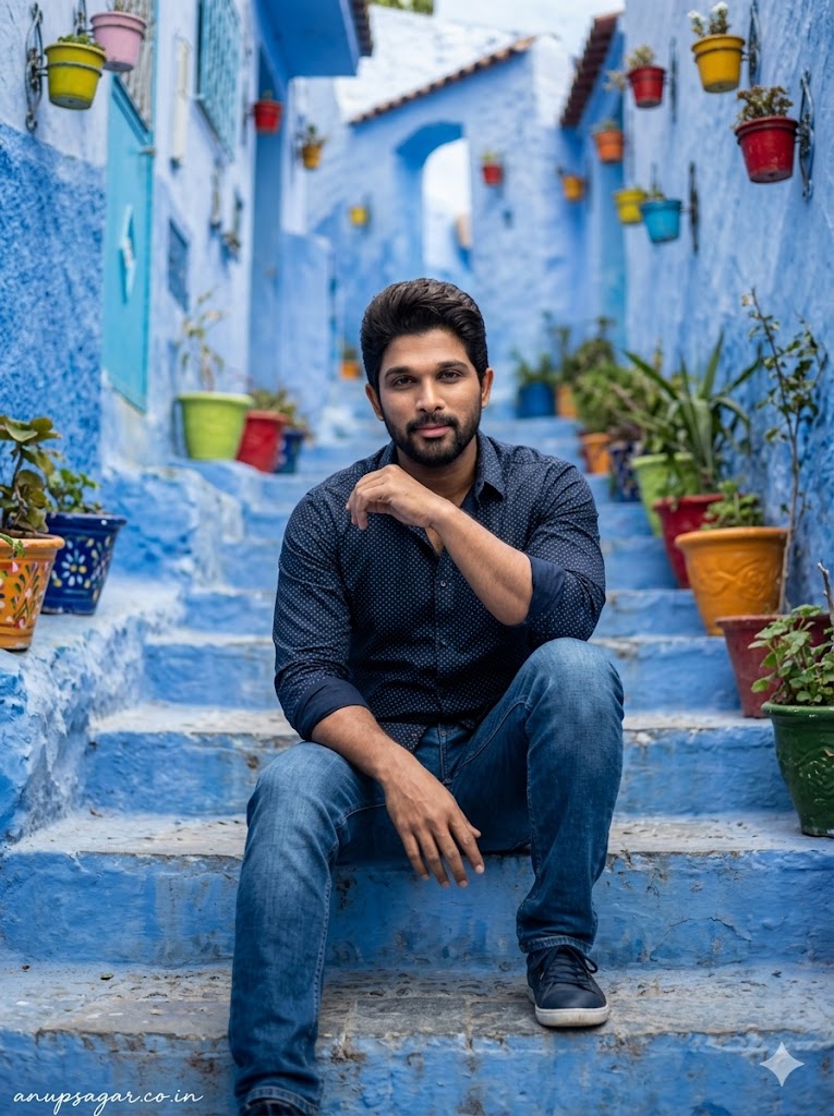 Create a full-body ultra-realistic cinematic travel portrait of a stylish young man sitting on the blue stairs of Chefchaouen, Morocco, with ultra-HD face clarity and sharp focus priority. FACE LOCK — ZERO MODIFICATION POLICY Use the uploaded reference image for the boy’s face. Face must remain 100% identical. Preserve exact facial structure, skin tone, eyes, nose, lips, and identity. No beautification or alteration. FACE CLARITY — ULTRA SHARP MODE Face must be extremely sharp, ultra-HD, with crisp edges, visible pores, and real skin texture. No blur, no smoothing, no cinematic over-blur. Face must be the clearest element in the image. ASPECT RATIO • 3:4 vertical STYLE Ultra-realistic DSLR photography, cinematic travel portrait, 8K detail, natural colors, sharp focus. SCENE Iconic blue staircase street of Chefchaouen with flower pots, textured steps, and Moroccan walls. POSE • Sitting on steps casually • One elbow resting on knee • Other hand relaxed • Stable posture (no motion blur) EXPRESSION Relaxed confident expression with natural look OUTFIT Modern casual outfit • T-shirt or shirt + jeans • Comfortable stylish look HAIR • Natural hairstyle, fully sharp LIGHTING • Soft daylight directly illuminating face • Balanced exposure • No harsh shadows on face BACKGROUND • Blue stairs and walls • Slight blur only in background • Subject clearly separated CAMERA & COMPOSITION • DSLR 85mm lens • Face-focused composition • Eye-level shot • Ultra sharp face with shallow depth-of-field NEGATIVE PROMPT face blur, low resolution face, identity mismatch, plastic skin, CGI look, distortion, extra limbs, over blur TEXT / SIGNATURE Add “anupsagar.co.in” at the bottom-left corner, HANDWRITTEN SIGNATURE-STYLE typography, thin cursive strokes, small size, subtle premium elegance, white or soft off-white color.
