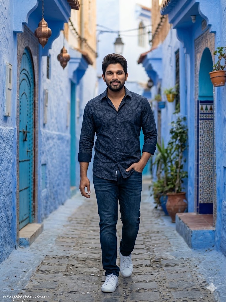 Create a full-body ultra-realistic cinematic travel photograph of a stylish young man walking through the iconic blue-painted streets of Chefchaouen, Morocco, with extreme face clarity priority and ultra-HD detail. FACE LOCK — ZERO MODIFICATION POLICY Use the uploaded reference image for the boy’s face. Face must remain 100% identical. Preserve exact eyes, nose, lips, cheeks, skin tone, and proportions. No beautification, no smoothing, no reshaping. FACE CLARITY — MAXIMUM HD PRIORITY Face must be razor-sharp, ultra-HD, crystal-clear with visible skin pores, natural texture, and crisp edges. No blur, no softness, no motion blur on face. Face must be the sharpest and most detailed part of the image. ASPECT RATIO • 3:4 vertical STYLE Ultra-realistic DSLR travel photography, cinematic composition, natural colors, 8K ultra detail, sharp focus. SCENE Narrow blue alley of Chefchaouen with layered blue walls, Moroccan doors, hanging lanterns, and textured stone path. POSE • Walking forward confidently • One hand inside pocket • Other hand relaxed naturally • Stable walking posture (no blur) EXPRESSION Calm confident expression with slight smile, looking forward OUTFIT Modern travel outfit • Casual shirt or t-shirt + jeans • Clean stylish look • Natural fabric texture HAIR • Natural hairstyle, sharp and detailed LIGHTING • Soft golden hour light hitting face directly • Even exposure on face • Balanced highlights and shadows BACKGROUND • Blue textured walls • Slight depth blur only behind subject • Clean separation from background CAMERA & COMPOSITION • DSLR 85mm lens • Focus locked on face • Eye-level cinematic framing • Full-body vertical shot NEGATIVE PROMPT face blur, motion blur on face, identity change, plastic skin, CGI look, low detail face, distortion TEXT / SIGNATURE Add “anupsagar.co.in” at the bottom-left corner, HANDWRITTEN SIGNATURE-STYLE typography, thin cursive strokes, small size, subtle premium elegance, white or soft off-white color.