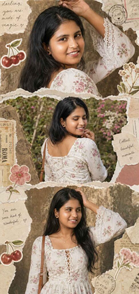 Use only the uploaded face (identical in all panels).Create an ultra-realistic 3-panel vertical collage (top/middle/bottom) of the same young woman.Outfit: White floral cotton kurti, square neckline (front/back), fited bodice withcorset lace-up, long bell sleeves with lacetrim. Minimal gold jewelry + shoulderhandbag. Same hair (long, slightlyvoluminous) and styling in all panels.Top: Close-up side pose, one arm raised, soft confident expression, warm lighting, textured background.Middle: Back pose, hand under chin, eyes closed smiling, natural daylight, outdoor garden.Bottom: Mid-shot front pose, hand on head, looking sideways, warm sunlight, slightly grainy backdrop.Style: Ultra-realistic scrapbook collage with torn paper edges, vintage textures, stickers (cherries/flowers), stamps, handwritten notes. Cohesive across all pannel