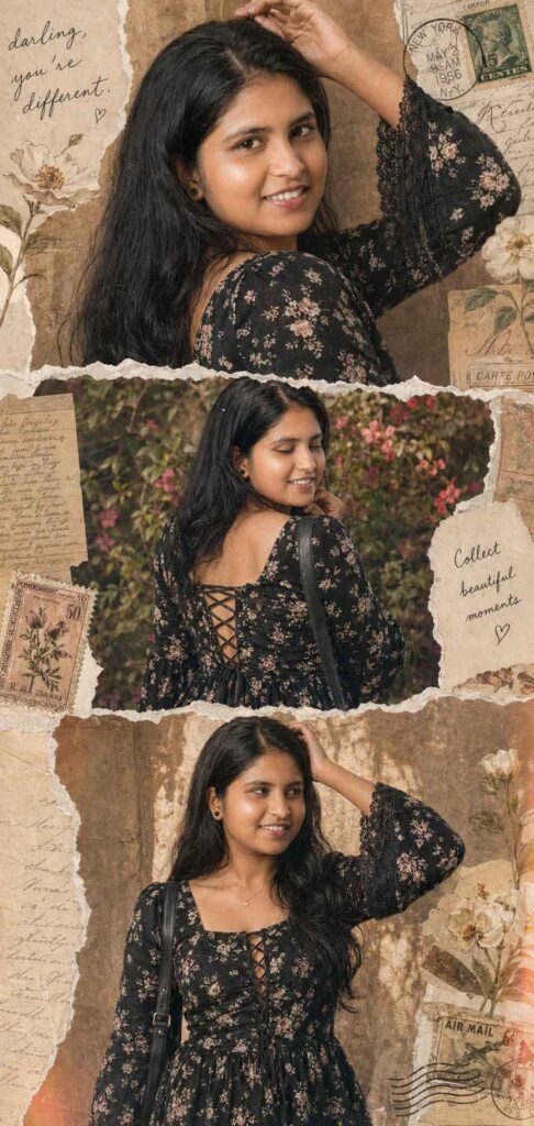 A high-definition vertical collage with a vintage scrapbook aesthetic, featuring three distinct panels of a woman with long, wavy dark hair. She is wearing a black floral-print dress with bell sleeves and an intricate lace-up corset detail on the back. The panels are separated by realistic white torn-paper edges. The background is filled with nostalgic elements: aged parchment paper, botanical sketches of white flowers, vintage postage stamps, and handwritten cursive notes like “darling, you’re different.” The lighting is warm and soft with a subtle film grain and light leaks, creating a dreamy, 90s-inspired cinematic mood. with same face & vertical