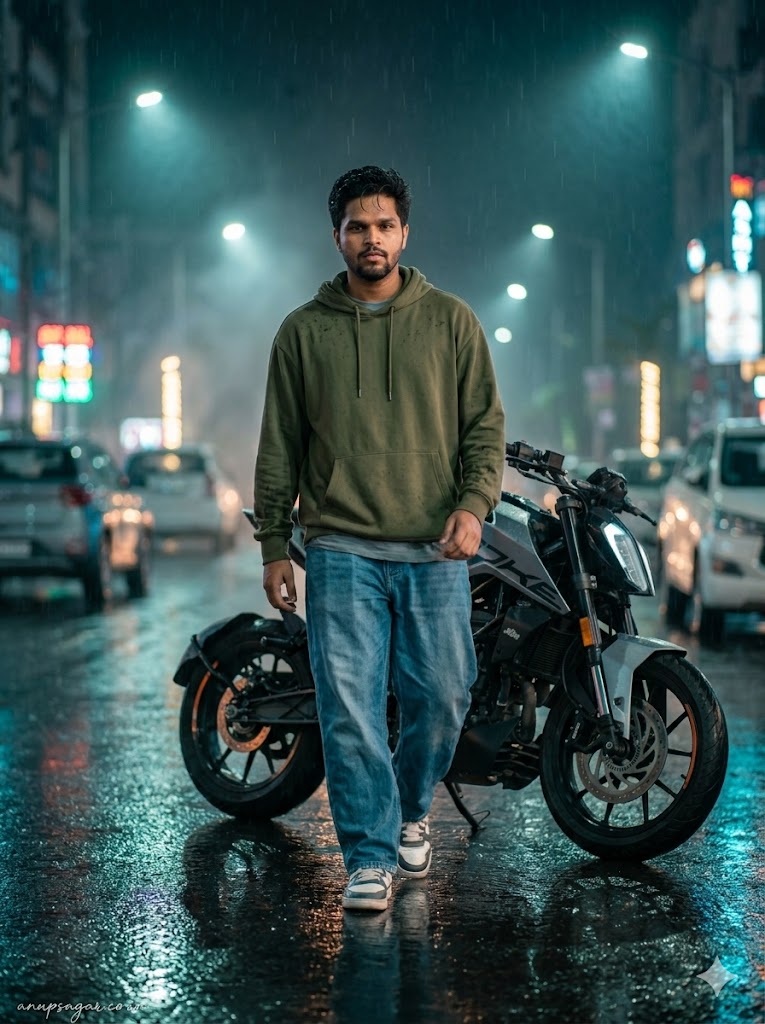 Create an ultra-realistic cinematic 8K full-body portrait of a stylish 19-year-old Indian boy walking past his parked modified sports bike on a rain-soaked city street at night, captured in a cinematic motion frame with wet reflections, soft fog, and dramatic lighting. Shot on Canon EOS R5 with RF 85mm f/1.8 lens. FACE LOCK — STRICT IDENTITY CONTROL Use the uploaded image as the ONLY face reference. Face must remain 100% identical — no reshaping, no beautification, no AI modification. Preserve exact facial structure, pores, hairstyle, age, and expression. If mismatch → REJECT & regenerate. FACE CLARITY — EXTREME ULTRA HD MICRO DETAIL Face must be EXTREME ultra-HD, razor sharp, crystal-clear with visible pores, fine skin texture, and natural highlights. Face must be the sharpest element in the frame. ASPECT RATIO • 3:4 vertical SCENE (URBAN RAIN SETUP) A wet city road with reflective asphalt, street lights glowing softly, green roadside plants, and light rain falling with cinematic fog surrounding the environment. SUBJECT & POSE (WALKING MOTION) Boy walking forward past the parked bike. One foot stepping ahead with slight motion blur on legs. Upper body stable and sharp. Hands relaxed or one hand slightly adjusting jacket. Full body visible. EXPRESSION Focused, calm confident expression, looking slightly ahead or off-camera. OUTFIT Oversized hoodie layered with loose t-shirt, baggy jeans, white sneakers — modern streetwear styling. HAIR & SKIN Messy hair slightly wet from rain. Skin must show pores, realistic tone, and subtle water highlights. LIGHTING Street lights and neon reflections creating warm + cool mixed tones with cinematic depth. COLOUR GRADING Teal-orange cinematic tones with high contrast and reflections. BACKGROUND Blurred road, plants, street lights, rain droplets, and soft bokeh. STYLE Ultra-realistic cinematic street photography, dynamic storytelling motion frame. CAMERA SETTINGS 85mm lens, shallow depth-of-field, HDR, 8K ultra HD. CAMERA & COMPOSITION Eye-level full-body shot, subject slightly off-center, ultra sharp face focus. IMPORTANT HARD RULE Face must remain EXACTLY identical and razor sharp. No distortion allowed. NEGATIVE PROMPT blur face, CGI skin, cartoon, distortion, low resolution, identity mismatch TEXT / SIGNATURE Add “anupsagar.co.in” at the bottom-left corner, HANDWRITTEN SIGNATURE-STYLE typography, thin cursive strokes, small size, subtle premium elegance, white or soft off-white color.