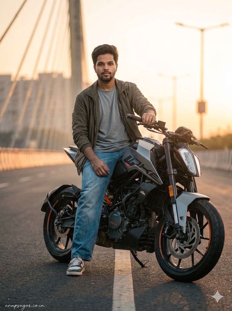 Create an ultra-realistic cinematic 8K full-body portrait of a stylish 19-year-old Indian boy standing beside a modified sports bike on a wide bridge during golden hour sunset, captured from a low-angle perspective to create a strong cinematic presence with warm glowing light and depth. Shot on Canon EOS R5 with RF 85mm f/1.8 lens. FACE LOCK — STRICT IDENTITY CONTROL Use the uploaded image as the ONLY face reference. Face must remain 100% identical — no reshaping, no beautification, no AI modification. Preserve exact facial structure, pores, hairstyle, age, and expression. If mismatch → REJECT & regenerate. FACE CLARITY — EXTREME ULTRA HD MICRO DETAIL Face must be EXTREME ultra-HD, crystal-clear, razor sharp with visible pores, fine skin texture, and natural highlights. Face must be the sharpest element in the frame. ASPECT RATIO • 3:4 vertical SCENE (BRIDGE SUNSET SETUP) A long empty bridge with railings, open sky, and distant city or horizon glowing in golden sunset light. Slight haze in air for cinematic effect. SUBJECT & POSE Boy standing beside bike with relaxed powerful stance. One leg slightly forward. One hand resting on handlebar. Other hand adjusting jacket or hanging loosely. Full body visible. EXPRESSION Calm confident expression with travel vibe, looking toward horizon or slightly off-camera. OUTFIT Loose t-shirt, open lightweight jacket, baggy jeans, white sneakers — casual modern styling. HAIR & SKIN Natural messy hair. Skin must show pores, warm sunlight highlights, and realistic texture. LIGHTING Golden hour sunlight creating warm glow, rim light, and soft shadows across subject and bike. COLOUR GRADING Warm tones (gold, orange, soft brown) with cinematic contrast and depth. BACKGROUND Blurred bridge, sky, and distant lights with soft depth-of-field. STYLE Ultra-realistic cinematic travel-street photography, premium editorial look. CAMERA SETTINGS 85mm lens, shallow depth-of-field, HDR, 8K ultra HD. CAMERA & COMPOSITION Low-angle full-body shot for strong perspective, ultra sharp face focus. IMPORTANT HARD RULE Face must remain EXACTLY identical and natural. NEGATIVE PROMPT blur face, CGI, cartoon, distortion, low quality, identity mismatch TEXT / SIGNATURE Add “anupsagar.co.in” at the bottom-left corner, HANDWRITTEN SIGNATURE-STYLE typography, thin cursive strokes, small size, subtle premium elegance, white or soft off-white color.