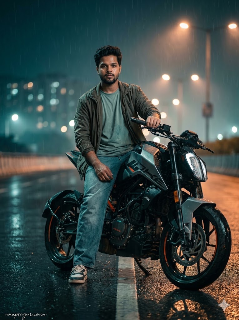 Create an ultra-realistic cinematic 8K full-body portrait of a stylish 19-year-old Indian boy sitting on a modified sports bike stopped on a wet highway at night, surrounded by light rain, fog, and distant city glow, captured in a cinematic travel-street fusion style with dramatic lighting and motion atmosphere. Shot on Canon EOS R5 with RF 85mm f/1.8 lens. FACE LOCK — STRICT IDENTITY CONTROL Use the uploaded image as the ONLY face reference. Face must remain 100% identical — no reshaping, no beautification, no AI modification. Preserve exact facial structure, pores, hairstyle, age, and expression. If mismatch → REJECT & regenerate. FACE CLARITY — EXTREME ULTRA HD MICRO DETAIL Face must be EXTREME ultra-HD, crystal-clear, razor sharp with visible pores, fine skin texture, and natural highlights. Face must be the sharpest element in the frame. ASPECT RATIO • 3:4 vertical SCENE (URBAN NIGHT HIGHWAY SETUP) A wide empty highway at night with wet asphalt reflecting lights, distant street lamps glowing softly, light rain falling and fog creating cinematic depth. SUBJECT & POSE Boy sitting on bike facing slightly sideways. One foot grounded, other resting on pedal. One hand gripping handlebar. Other hand resting casually on thigh. Body slightly leaned forward. Full body visible. EXPRESSION Focused, calm, slightly intense expression with travel vibe, looking ahead or off-camera. OUTFIT Loose oversized t-shirt, open jacket, baggy jeans, sneakers — casual street style. HAIR & SKIN Hair slightly wet and natural. Skin must show pores, realistic texture, and rain highlights. LIGHTING Street lights creating warm highlights mixed with cool ambient tones from rain and fog. COLOUR GRADING Teal-orange cinematic tones with high contrast and reflective surfaces. BACKGROUND Blurred highway lights, fog, rain droplets, soft bokeh effect. STYLE Ultra-realistic cinematic street-travel photography, dramatic storytelling look. CAMERA SETTINGS 85mm lens, shallow depth-of-field, HDR, 8K ultra HD. CAMERA & COMPOSITION Eye-level or slight low-angle full-body shot, dynamic composition, ultra sharp face focus. IMPORTANT HARD RULE Face must remain EXACTLY identical and natural. NEGATIVE PROMPT blur face, CGI, cartoon, distortion, low quality, identity mismatch TEXT / SIGNATURE Add “anupsagar.co.in” at the bottom-left corner, HANDWRITTEN SIGNATURE-STYLE typography, thin cursive strokes, small size, subtle premium elegance, white or soft off-white color.