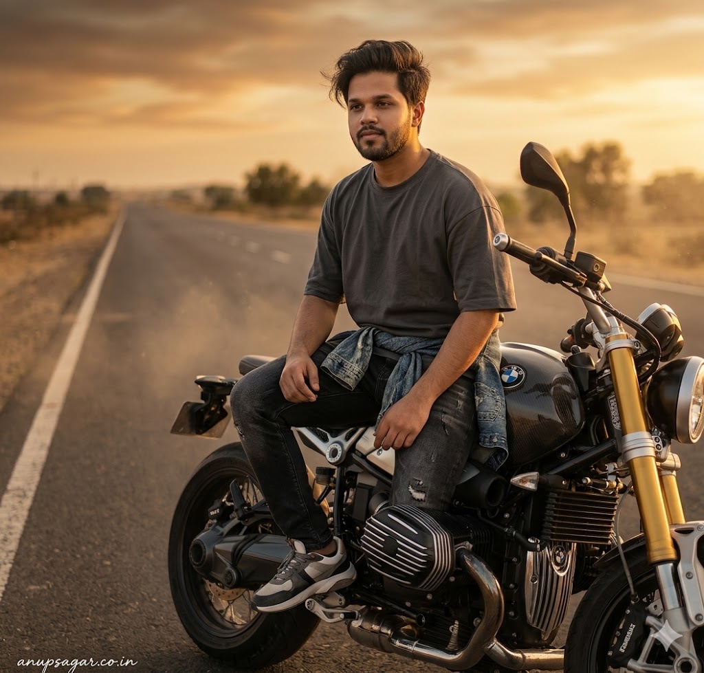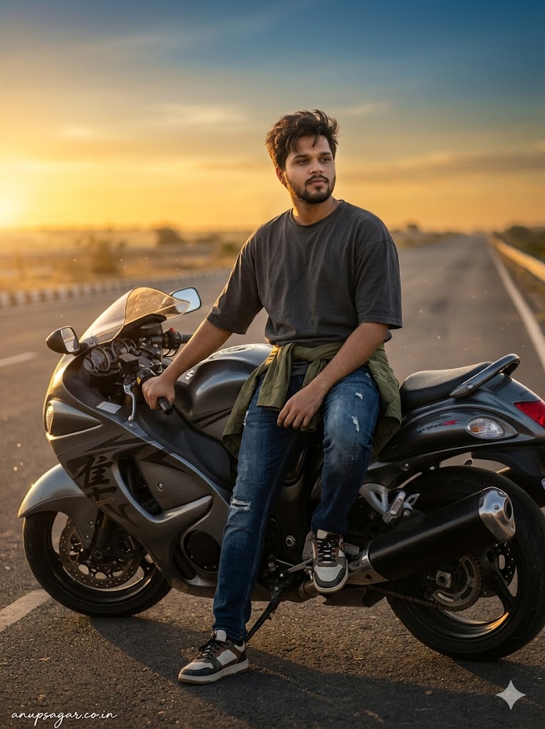 Create an ultra-realistic cinematic 8K full-body portrait of a stylish 19-year-old Indian boy sitting on a powerful sports bike parked on an empty highway during sunset, captured in a cinematic travel-fashion style with warm golden light and dramatic depth. Shot on Canon EOS R5 with RF 50mm f/1.8 lens. FACE LOCK — STRICT IDENTITY CONTROL Use the uploaded image as the ONLY face reference. Face must remain 100% identical — no reshaping, no beautification, no AI modification. Preserve exact facial structure, pores, hairstyle, age, and expression. If mismatch → REJECT & regenerate. FACE CLARITY — EXTREME ULTRA HD MICRO DETAIL Face must be EXTREME ultra-HD, crystal-clear, razor sharp with visible pores, fine skin texture, and natural highlights. Face must be the sharpest element in the frame. ASPECT RATIO • 3:4 vertical SCENE (HIGHWAY SUNSET SETUP) An empty road stretching into distance with open landscape, trees, and sky glowing in golden sunset tones. Slight dust and haze in air for cinematic depth. SUBJECT & POSE Boy sitting on bike casually. One foot on ground, other on footrest. One hand holding handlebar. Other hand resting on thigh. Body slightly leaned forward. Full body visible. EXPRESSION Relaxed confident expression with travel vibe, looking toward horizon or slightly off-camera. OUTFIT Loose t-shirt, denim jeans, casual jacket tied around waist or worn open, sneakers. HAIR & SKIN Natural messy hair. Skin must show pores, warm sunlight highlights, and realistic texture. LIGHTING Golden hour sunlight creating warm highlights and soft shadows across face and bike. COLOUR GRADING Warm tones (gold, orange, brown) with cinematic contrast and travel mood. BACKGROUND Blurred road, sky, and trees with soft depth-of-field. STYLE Ultra-realistic cinematic travel photography, premium lifestyle editorial look. CAMERA SETTINGS 50mm lens, shallow depth-of-field, HDR, 8K ultra HD. CAMERA & COMPOSITION Slight low-angle full-body shot for powerful perspective, ultra sharp face focus. IMPORTANT HARD RULE Face must remain EXACTLY identical and natural. NEGATIVE PROMPT blur face, CGI, cartoon, distortion, low quality, identity mismatch TEXT / SIGNATURE Add “anupsagar.co.in” at the bottom-left corner, HANDWRITTEN SIGNATURE-STYLE typography, thin cursive strokes, small size, subtle premium elegance, white or soft off-white color.